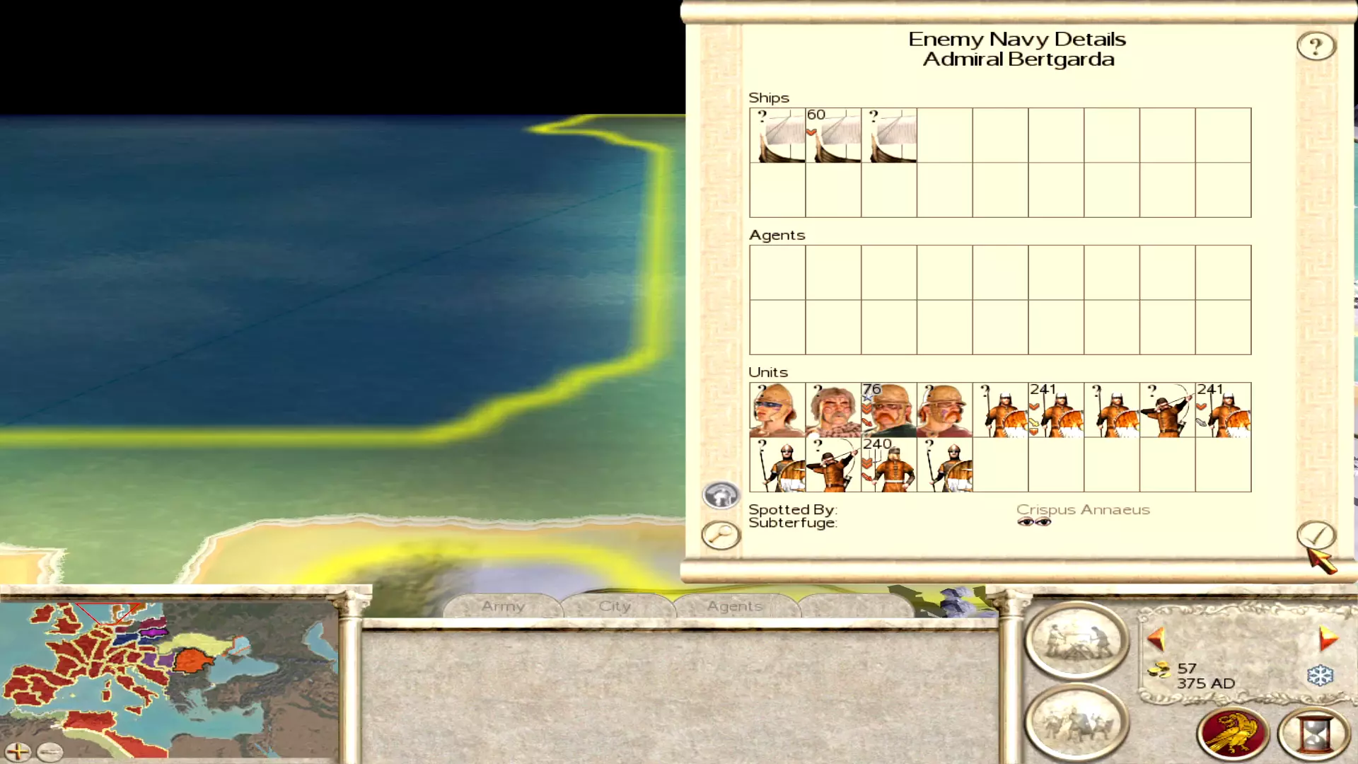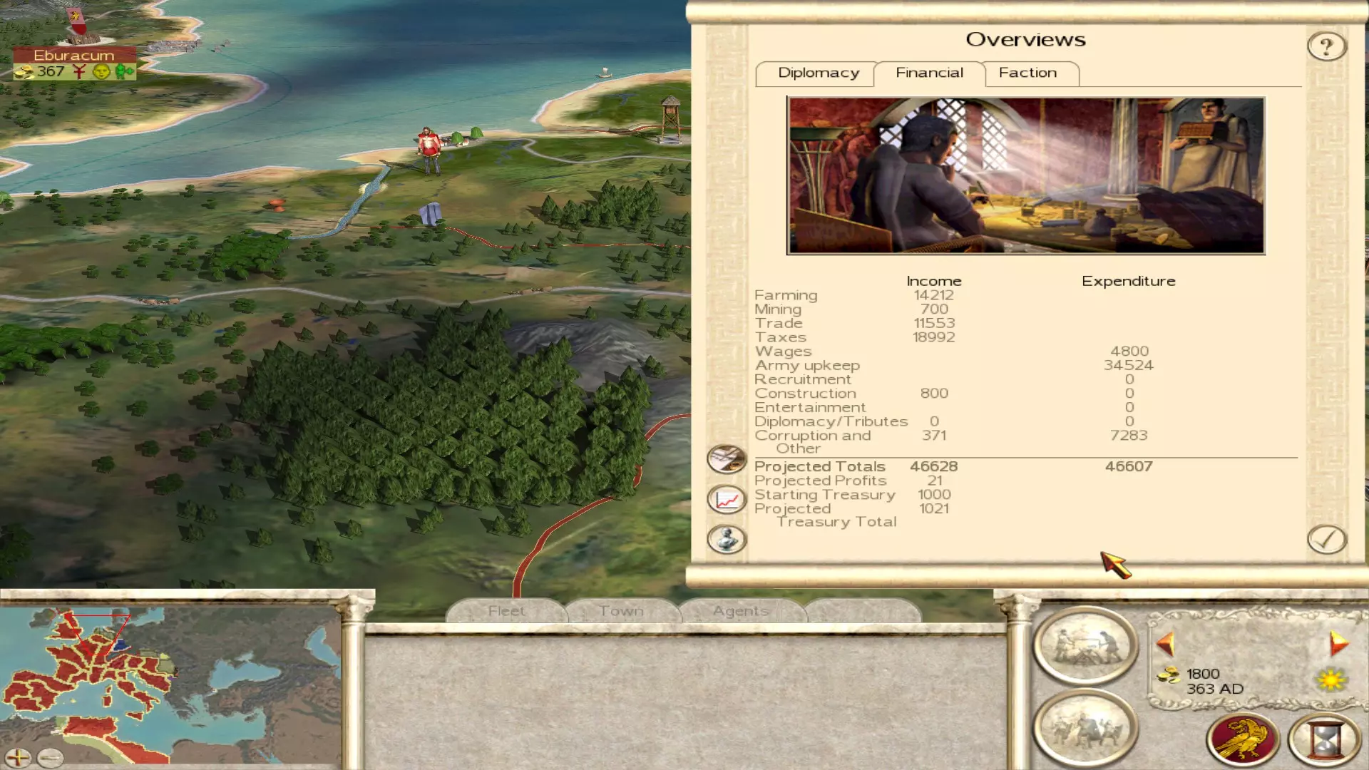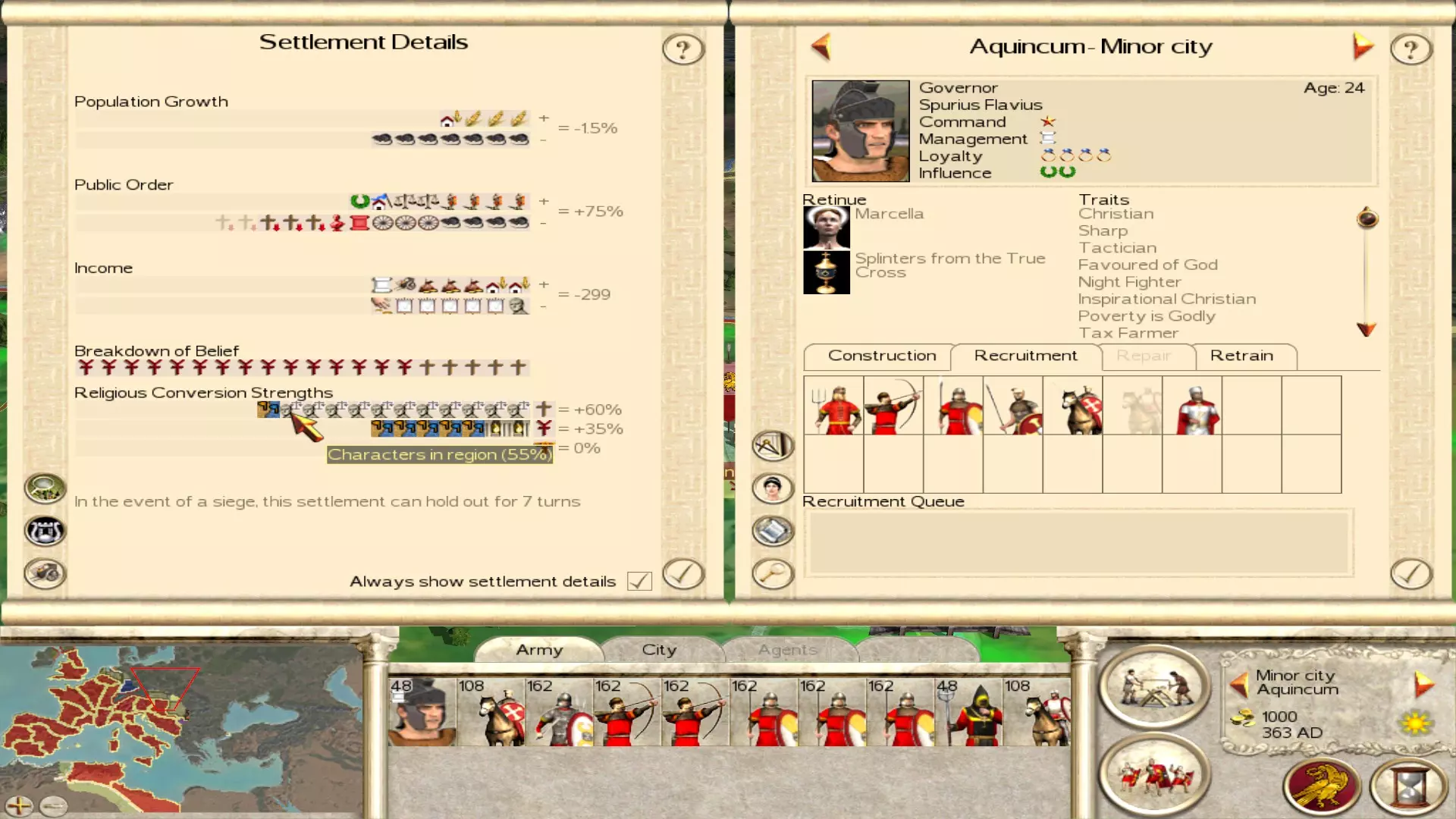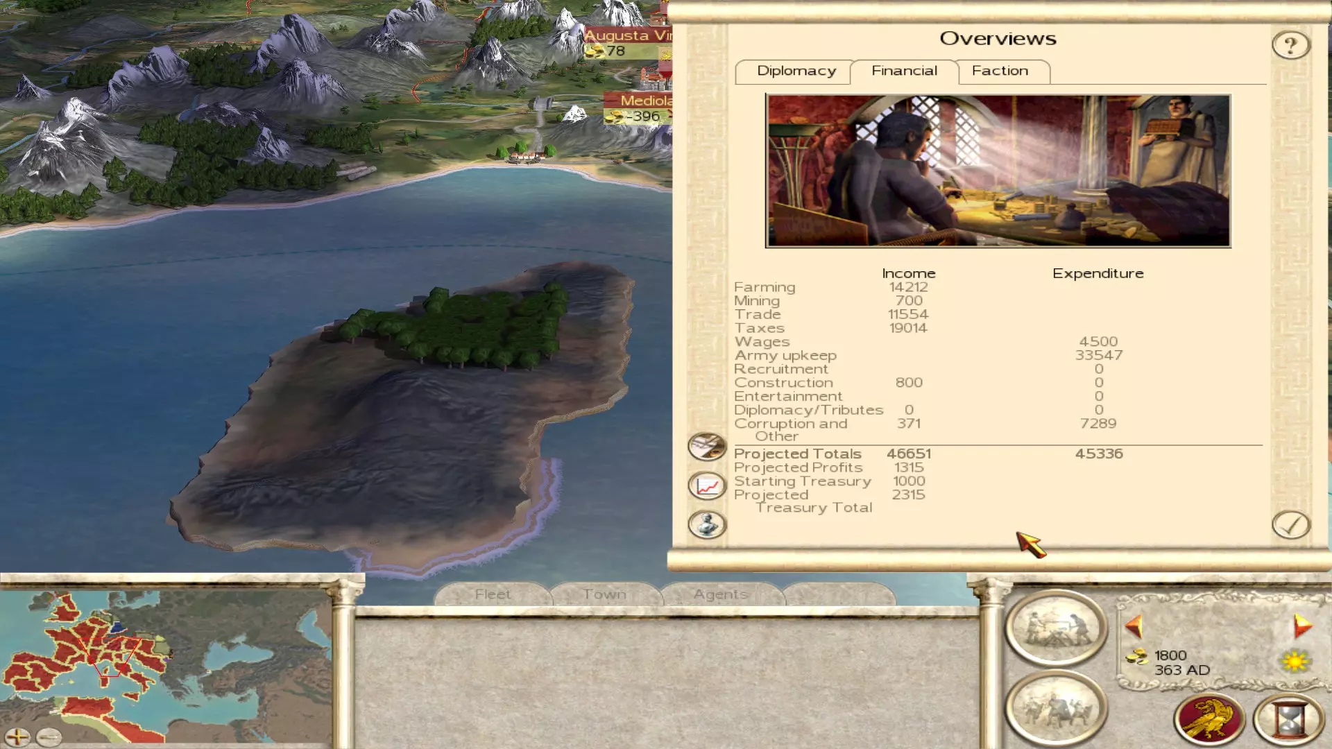 Finances of the Western Roman Empire at the start of the game. Like mentioned in the previous chapter, you will be spending the little money you have for the most part on making sure your settlements stay under control. For the majority of settlements this will take a few turns, as most immediate problems can be solved quickly by training some peasants, but that obviously won't mean the public order is magically fixed. So for the first few turns you will be mostly busy with the previous chapter. Once the dust of the first few turns has settled, and public order isn't the biggest point on the agenda anymore, it's time to make some money! A lot of cities are underdeveloped at the start of the campaign, so a lot of work needs to be done to make them financial powerhouses. Since the amount of money you'll be making will not be too much, not all cities will be building something at all times. So divide your attention across your empire. It will take a while until you make enough money to build anything in every city at any time, so until you reach that point you have to be careful with how you spend your money and on what. There are two prime ways of making more money with your own settlements: Increasing income Reducing expenditure Increasing income Like mentioned earlier, you start with a lot of underdeveloped settlements. Even settlements that can make a ton of money just due to their position will barely break even at the start. The income of a settlement is earned in three ways: Farming Taxes Trade This list is in ascending order, since trade (even internally between your own settlements) is extremely powerful. Send diplomats to start up as many trade routes as possible and focus on building ports and roads in your cities around the Mediterranean. These cities will become your financial powerhouse if developed correctly. Take the city of Caralis for example. At the start of the campaign it has just a wooden wall... that's it! Just building a level 1 port here will make you a couple hundred denarii already! Farms and taxes kind of go hand in hand. The better your farms are, the more people arrive and the more taxes they'll pay. Increasing the population by upgrading the farms will also ensure the city will grow faster, meaning you can upgrade the city quicker. This does come with the issue that more people means more squalor, which in turn means less public order. So only focus on increasing the population in cities if you know for sure you can handle the problems that come with it. I will also advise you to spend most money on financial development in the cities that are least likely to come under attack. Spain, Gaul and the islands of the Mediterranean are quite far away from any immediate action (with the exception of the revolts mentioned in the previous chapter) and can be developed rather safely. The cities in Italy are a bit of an exception, as they will most likely see fighting rather early on, but developing them (financially and militarily) is kind of important since you don't want to lose these huge and important cities! Reducing expenditure Besides the expensive units used as garrison mentioned in this guide already, corruption is the biggest reason your income will be low at the bottom of the line. The key ingredient to fix this issue is law. The law bonus not only gives public order, but it also reduces corruption, so increasing law in a settlement actually tackles two problems at once! Academies and walls give law in BI while they do not in regular RTW, so use this wisely. Pagan temples provide more law than Christian churches, especially the temple to Sol Invictus. Focus on building these types of buildings in order to reduce corruption. You can even tackle multiple issues at once, like building a wall for the law it provides but also because there is a group of barbarians on the way that will have to assault a stone wall now, as an example. I already mentioned the reducing of expensive garrison a bit, but I'll mention it properly here. Lots of cities have Foederati cavalry or infantry as garrison. They are WAY too expensive for providing the simple garrison tasks that peasants can execute just as well. Replace all the Foederati with peasants over time, it will save you thousands of denarii per turn. Ideally you want all cities, with the exception of cities located on the frontline, to just have peasants as garrison. If you feel a little unconfortable having just peasants, you can also go for Archers or Limitanei as additions to the garrison. They are not too expensive and give you a bit of flexibility. Conquest I will talk more in depth on this topic in the military chapters of the guide, but it's nice to mention it here briefly, as conquering stuff will always provide an increase in wealth. All I'll say is, there's a reason the Eastern Roman Empire has an easier and stronger start than the Western Empire: their territories are wealthier! After dealing with internal struggles first, expanding into Greece and Asia Minor will yield the most financially. The Eastern Empire will most likely have their troops at their borders with the hordes in the North and the Sassanids in the East, leaving everything in between up for grabs. Focus on taking these regions, they are worth a ton! Advanced tips Disbanding all/most boats at the start of the campaign is a useful trick, since you won't really need them in the beginning and they are going to be constantly attacked by pirates anyway. That will save you a few hundred denarii in the first turn already. Keeping some boats near Britannia for easy access to the Celts is useful, but you'll barely be using the vast number of ships in the Mediterranean. So these can easily be disbanded to save some early money. Keep in mind, in order to disband a fleet, it has to be in a port!