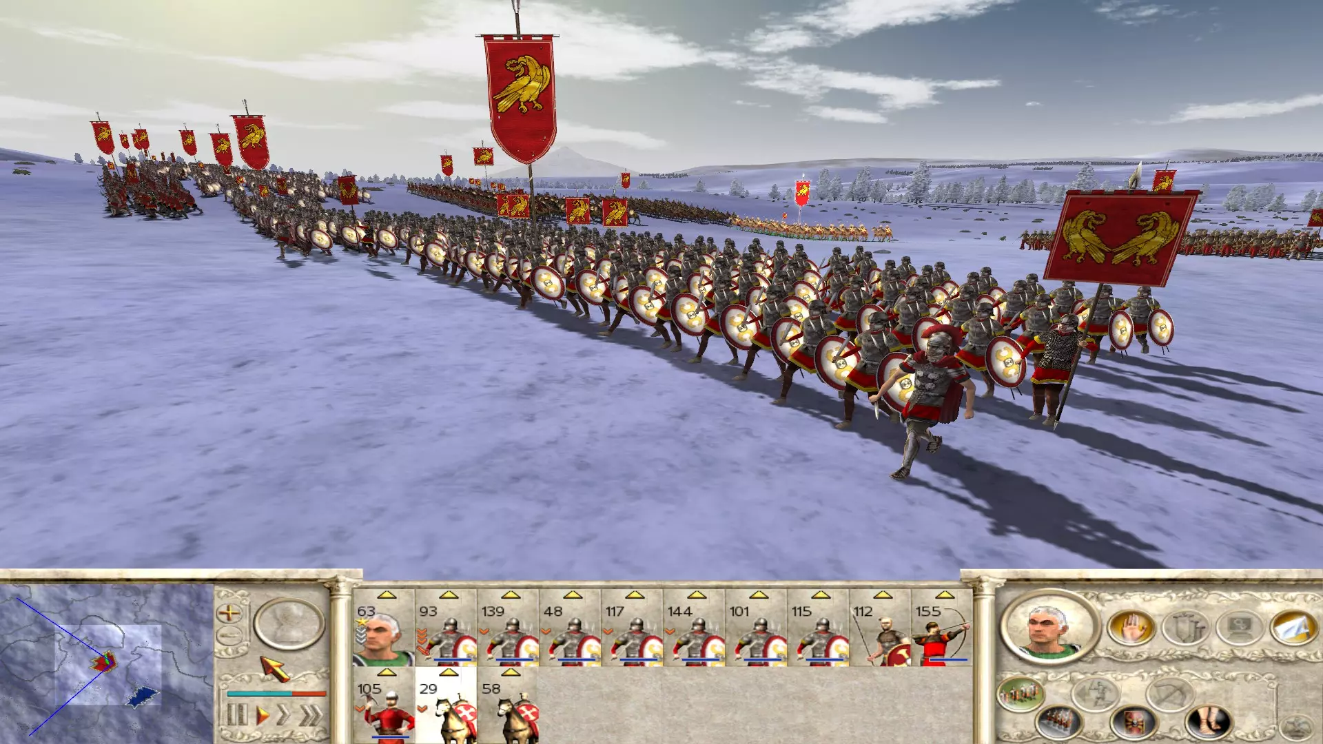 西罗马帝国的财政状况,我仍处于第一回合,但已对所有需要的城市降低了税收,大部分舰队以及一些昂贵的驻军单位已被解散。财政盈余从21第纳尔提升到了1315第纳尔。这可能不是最大的差距,但要记住,我所有的定居点的公共秩序也都已稳定! 军事方面 如前所述,在游戏初期你可能需要稍微缩减军事规模。解散像同盟军这样昂贵却战力不佳的单位,或者将他们派往前线送死。游戏开局是关键,因为你一开始就与多个派系处于战争状态,必须在他们有机会发展壮大之前迅速将其消灭。你一开始会与以下派系处于战争状态: 阿勒曼尼人 柏柏尔人 凯尔特人 萨尔马提亚人 不用理会柏柏尔人,他们的军队 roster 很差劲,除非你极度无能,否则绝不会把迦太基输给他们。萨尔马提亚人会在战役初期接受和平条约(有时甚至会为此付钱给你),所以尽快派外交官过去。这样就只剩下阿勒曼尼人和凯尔特人了。 这两个派系的一大特点是:他们无法变成游牧部落!如果你攻占了他们最后的定居点,即便地图上还有其他家族成员,该派系也会直接灭亡!阿勒曼尼人只有一个定居点,而你在附近一开始就有不少军队,所以可以在3个回合内消灭他们。调动你初始就在他们首都附近的军队,去完成这项任务吧。如果有必要,你可以用奥古斯塔·温德利科伦的部队提升军团等级。