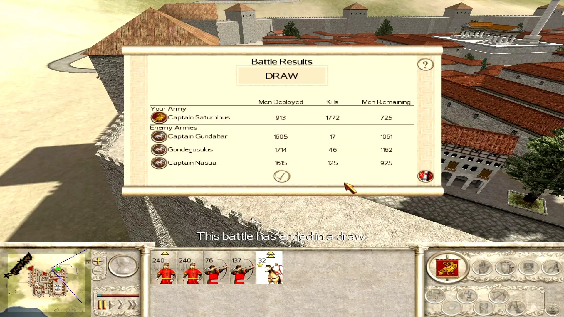 萨洛纳城墙外躺着大量汪达尔人的尸体。注意到弓箭手们因射杀了下方数千人而获得的经验值。