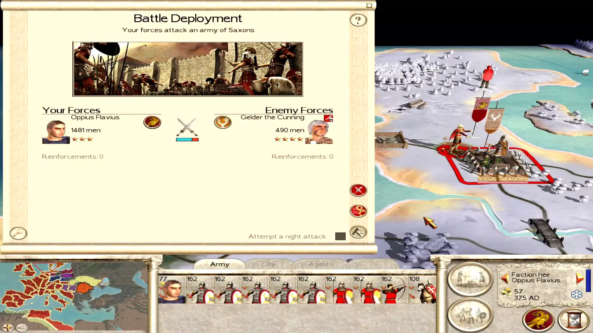 由能力尚可的将军指挥的野战军军团,足以在相当长一段时间内维持帝国边境的稳定。 对付蛮族: 如前所述,要尽早且迅速地消灭凯尔特人和阿勒曼尼人。他们无法形成部落联盟,还能提供新的土地以增加税收、招募士兵和加强防御。真正的问题在于其他一些蛮族派系。撒克逊人总会派遣舰队前往不列颠(他们在那里有胜利条件),有时法兰克人或勃艮第人可能会成为聒噪且不可信的邻居,当然还有那些涌入欧洲的部落联盟。东罗马帝国也很可能在某个时候背叛你。以下是针对各麻烦派系的一些小贴士: 撒克逊人 预先派遣一支军队前往他们的领地(或让军队在附近的船上待命)。一旦发现他们已将军队装载上船并驶向不列颠,立即宣战并发起攻击!与凯尔特人及阿勒曼尼人一样,撒克逊人无法转变为游牧部落。迅速占领防御薄弱的萨克森村庄,海上的整支军队就会解散!