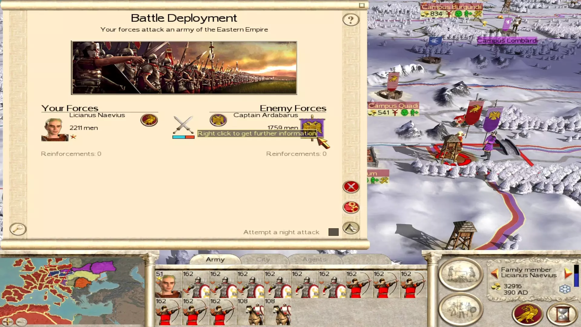 像这样一支相当基础的军团,轻松就能应对一支庞大的东部帝国军团。 与东部帝国交战时,要试着攻击他们的要害。你可以正面进攻,对抗东部的大型军团,但在这种情况下,更巧妙的策略可能效果更好。进攻他们在希腊和小亚细亚的土地,或者经由利比亚前往埃及和巴勒斯坦。东部帝国的所有军团要么在阿昆库姆及其周边地区对付蛮族部落,要么在东部对抗萨珊王朝。而两者之间的所有地区(都是非常富庶的定居点)很可能防御薄弱。如果你攻击那里,就正好击中了他们的经济核心!拿下这些城市,他们很快就无力负担边境上那些昂贵的军团了。如果他们调回这些军团来应对你的入侵,其边境上的敌人就会有机可乘,这对你是有利的! 因此,在准备入侵东部帝国时,可以考虑这个策略。如果你直接对抗东部帝国兵力最集中的地区,最终或许能取得胜利,但这真的是推翻他们最快、最有效的方法吗?要记住,每场战役都不尽相同,东部帝国的部落和兵力集中在不同的位置,所以你的情况可能需要不同的策略!