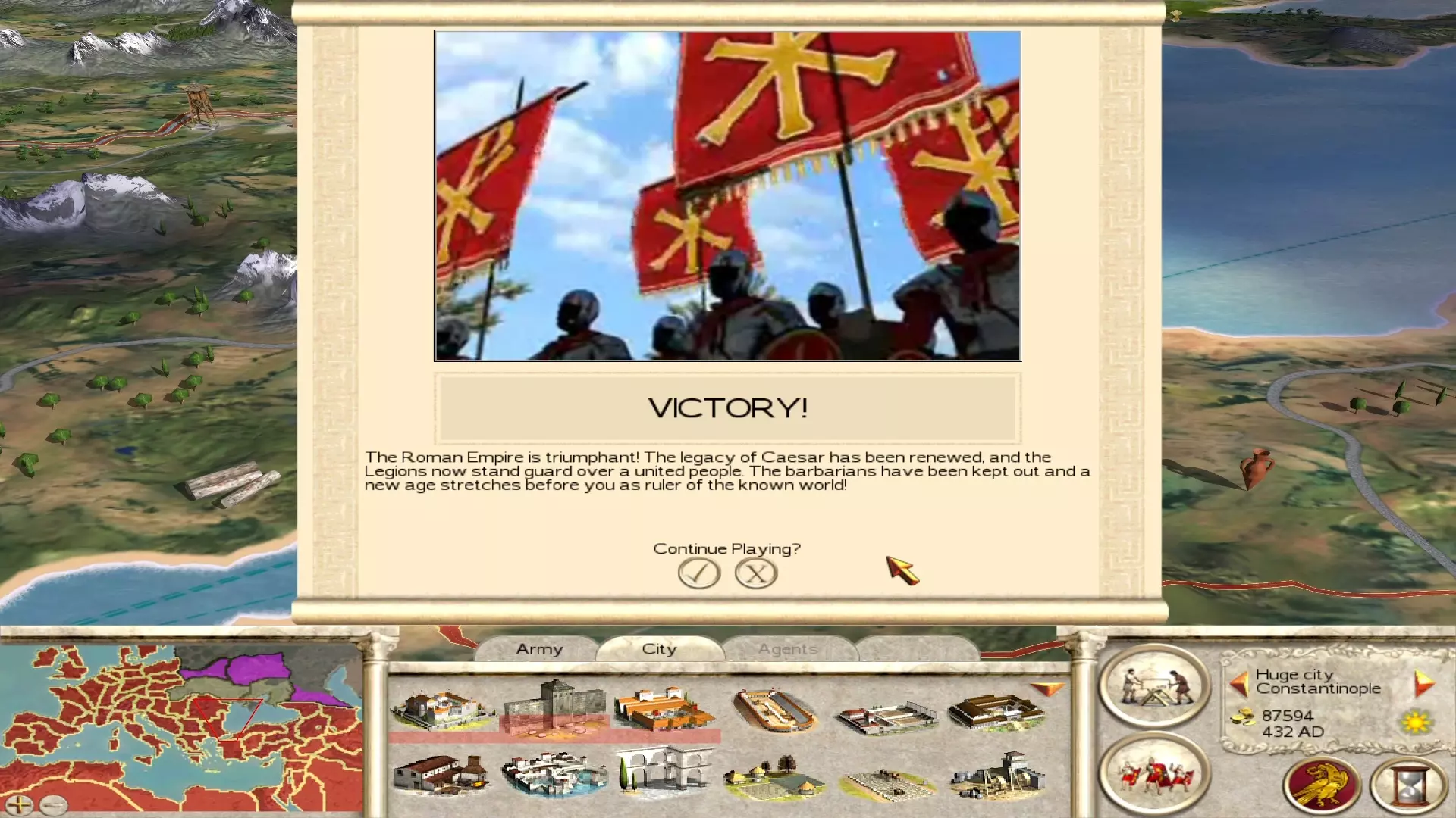 与此同时,雅典作为一个非常富庶的定居点,其防御情况就是这样。 进阶技巧: 如果东罗马帝国(或者任何与你处于战争状态的派系)要求你成为他们的附庸国,接受这个要求,但要提出让他们在多个回合内定期向你支付数千第纳尔的贡金。AI很可能会接受这一条件,然后在几个回合后对你宣战,这意味着你在这几个回合里白赚了一笔钱。在《罗马:全面战争》中,不要害怕接受附庸身份,这没什么大不了的。你唯一需要担心的是确保你的银行里没有太多钱。如果你是某个势力的附庸国,那么每回合结束时,超过10000第纳尔的部分都将支付给你的宗主国。所以要确保在结束回合前,在一些城市中预建几座建筑,使资金降至10k以下。回合结束后,取消预建的建筑就能收回资金。显然,只有在对你有利而非对方有利的情况下,才接受成为他人的附庸国。如果你已经能赚取大量资金,并且拥有许多高质量的军队,就没有必要接受成为附庸国。 宗教方面 在战役初期,无论你打算选择异教还是基督教,都不必过多费心于宗教事务。你有更重要的事情需要处理。只需确保你的城市不会发生叛乱,宗教问题可以稍后再考虑。为了将一座城市改信其他宗教而导致其叛乱,进而在数回合内失去整座城市是完全不值得的。你只需忍受几回合因“与派系领袖宗教不同”或其他类似原因造成的10%公共秩序惩罚即可。把你的时间和金钱用在提升公共秩序、军队维护以及上述提到的其他事务上,而不是宗教方面。 当你有时间(和金钱)去考虑宗教问题时,有很多选择。如果你打算信奉基督教:在 campaign 初期,阿奎因库姆有一个人,他的随从拥有大量基督教圣物,能在几天内让任何城市改信!你可以把他当作一种传教士,让他在帝国各地游历并进行传教。当大部分人口都信仰基督教后,摧毁神庙并将其替换为教堂,然后让那个人前往下一个区域。