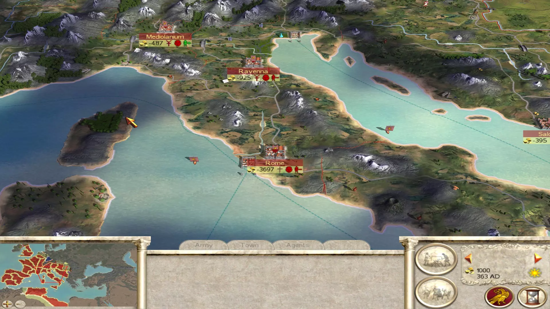 我西罗马帝国战役的结局截图。你看到的所有大型驻军都是军团,其兵力与军队面板上显示的相似。 战役初期 开局至关重要:如果开局不顺,之后的很多回合也会很艰难。因此,你需要做好几件事,主要是财政和军事(这两者密切相关,因为大部分开支都会用于军队维护)。慢慢来,很多事情需要同时处理,所以如果第一回合花费很长时间也不要惊讶。
