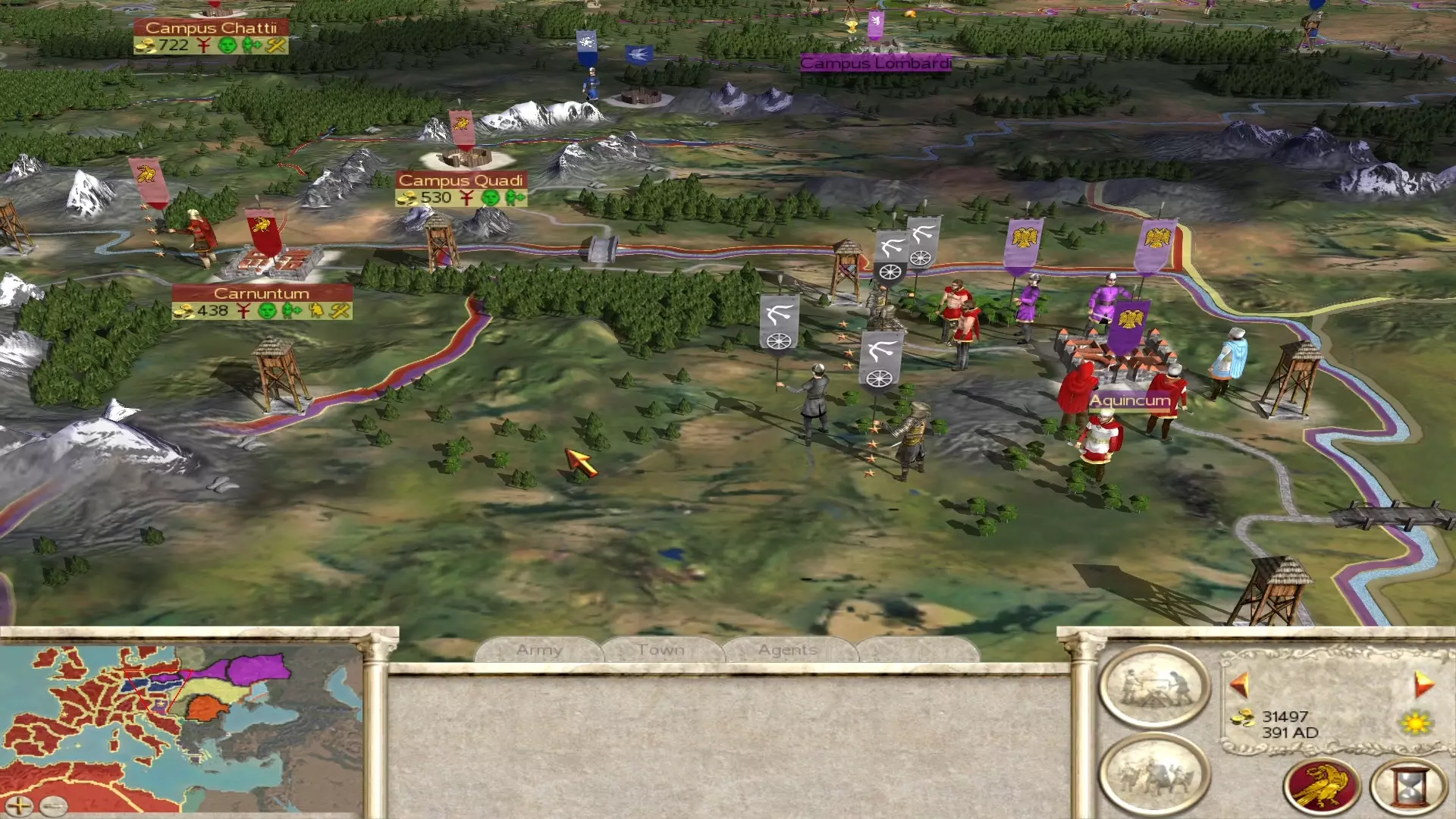 已经过了3回合,阿勒曼尼人已被消灭。回合1:集结并调动军团。回合2:围城并建造攻城槌。回合3:发动进攻并摧毁城市。 早期军团集结 如上所述,你可以快速集结一些部队来对抗阿勒曼尼人和凯尔特人。在战役初期,这一点非常重要,因为你的大多数城市都没有发展到足以训练最精锐(甚至是最基础)部队的程度。即便你的城市能够训练,你的经济也无法支撑,这意味着在战役开始的大部分时间里,你只能利用现有的资源!这就是为什么用农民替换城市驻军很重要。除农民外,所有更高等级的单位都有其价值。这些单位在前线作战时的使用效率,要比闲置在某个随机定居点、每回合浪费大量第纳尔(denarii)维持费时高出千万倍。仔细查看可抽调部队的地点,组建军团投入战斗吧!