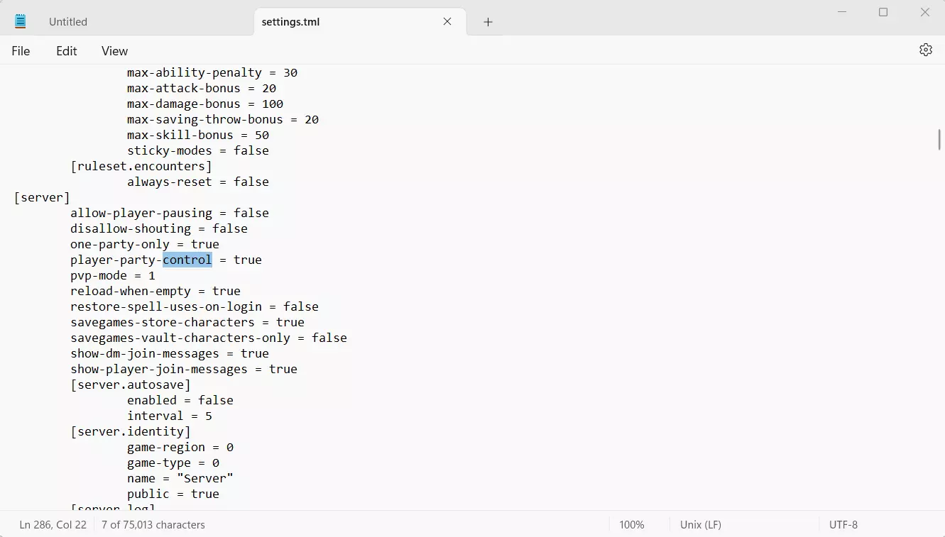 你需要找到的就是这个部分。在我的文件中,setting.tml位于文件夹的最底部。 步骤2:找到文件后,点击它并在文本编辑程序中打开。如果你使用的是Windows电脑,Windows记事本就可以。 打开后,寻找“party control”相关设置。你可以使用程序中的搜索功能,搜索“party”或“control”来简化操作。该设置的值为“false”。删除“false”并输入“True”。你要找的内容是“player-party-control=false”。