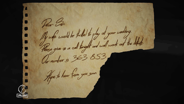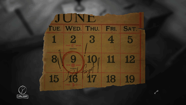 这条线索指的是你可能在三章前见过的一张纸,上面写着“别忘了!”。因此,我先给你解释一下在哪里能找到那张纸: 在第三章,你会来到第一张动图中的房间,在其中一个抽屉里你会看到一页日历。这是六月的日历,上面标记了9号。 此外,为了让你清楚这个日期的重要性,你还能在婚礼请柬上两次看到它:一次是在第一章开头,在你找到戒指的那个房间的书桌上;另一次是在第五章开头,在你接下来看到的动图中的书桌上(就是那个你需要转圈的房间)。邀请函上显示着相同的日期,显然这是一个重要的日子,因为这是周年纪念日。