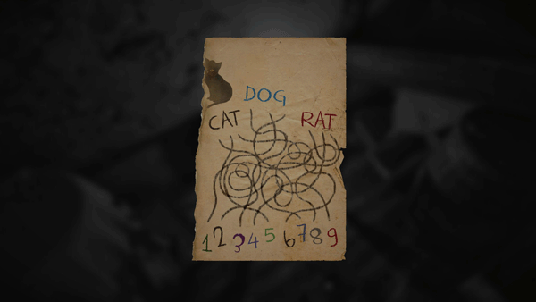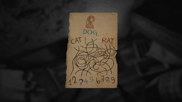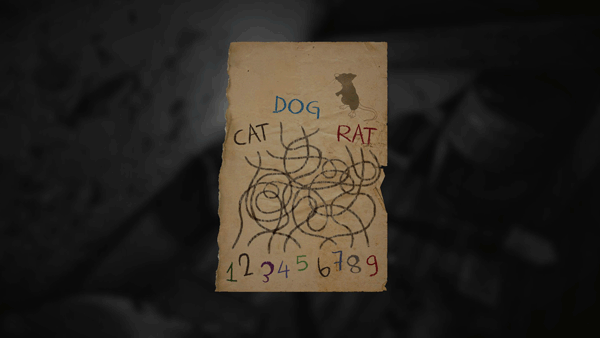 门 第五集 解法:取决于你游戏中出现的图案,可能是3、4、1,或2、5、9,或6、8、7。 跟随一只老鼠后,它会把你引到困境中,让你被困在如图所示的房间里,因此你需要打开带锁的门。唯一的线索是一张有许多交织线条并指向数字的纸。根据你纸上绘制的动物(每局游戏会变化),你需要沿着每个字母下方的线条找到对应的数字,并按顺序输入到锁中。