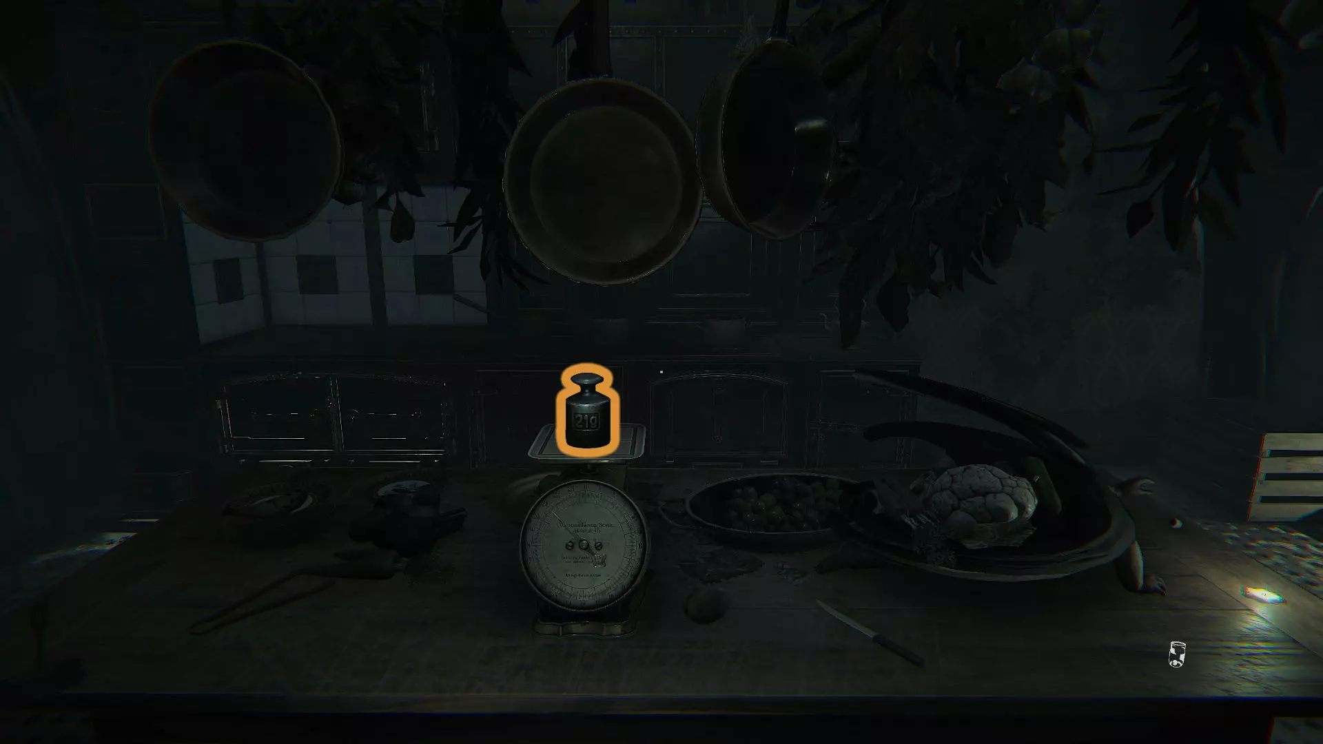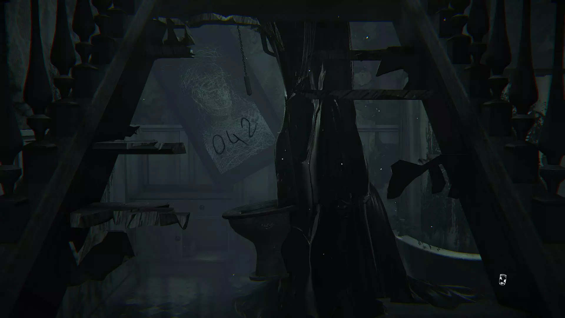 要让密码数字显示出来,你需要一直推进剧情,直到需要与厨房互动。因为当你在天平上放置重物时,会听到一声撞击声,这是浴室那边发出的动静。如果你进入浴室,会发现里面发生了很大变化,而且背景的画现在已经旋转了,上面写着0、4和2。在保险箱中,你需要输入数字00、40、20。