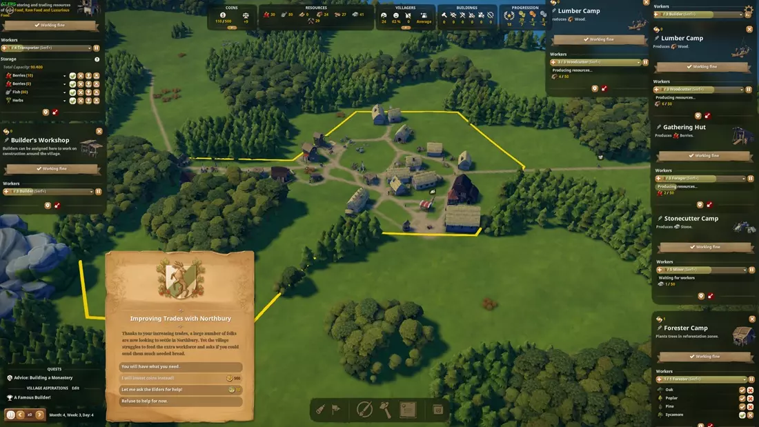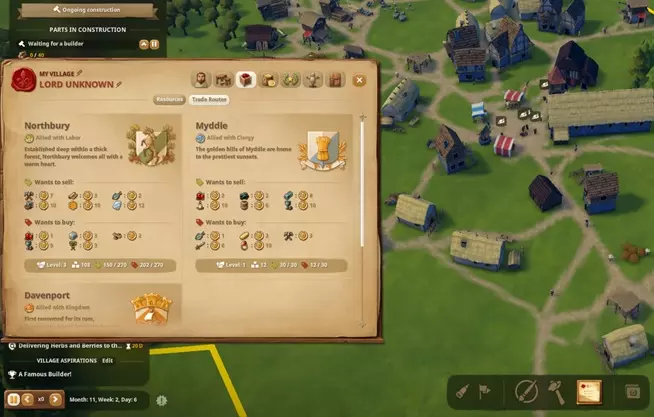 2. 交易等级提升 智能交易是怎么回事呢? 第一个交易伙伴(劳工)很容易就能用20块木板解锁。 他会从我们这里购买浆果和木板,但每次购买仅限12个。 为了能向他出售更多(48个),我们需要尽快将交易升级到2级。 2级要求在一个日历月内(第1周初到第4周末)完成30次出口和30次进口。 出口条件几乎是自动完成的,但进口的开启很容易被忽略。 理论上,商人会出售布料和鱼类。但实际上,据我观察,我只买到过鱼类。一旦达到30单位出口/30单位进口,就会有信使前来,提出提升贸易等级的机会,但需要支付相应代价: - 在60天内交付50条面包 - 支付500枚金币 - 消耗10点劳动力影响力 如果无法支付上述代价,贸易等级提升进程将被封锁3个月!(这一点需要牢记)。 当然,在游戏初期阶段,10点影响力很可能是最优先的选择。但你需要在需要时确保拥有足够的储备。 达到30单位进口/30单位出口的速度相对较快,但在拥有10点影响力之前,最好暂缓进口。 我在诺斯伯里贸易站大约用了三个半月获得了这次“晋升”,不过也有可能更早一些。 提升到第二级贸易等级后,你现在可以销售48单位商品,而不是之前的12单位。这意味着如果你现在大力发展木板和浆果产业,很快就会获得大量收入,届时你将不得不一块块购买土地,以免收入白白浪费。 第三个贸易等级也相当容易达成,但现在不必急于追求。在第二等级时,你的收入已经相当可观了。此外,第三等级的成本是第二等级的四倍(例如40影响力等)。 3. 通过最大化新移民数量实现快速发展 比提升贸易等级更重要的是获得【良好声誉】特权,这样新移民就不会因为高税收而却步。 现在,即使幸福度几乎降到零(在高税收情况下),新移民仍会大量涌入(数量多或达到上限)。“白鸽”特权(如“虔诚民众”和“所有信徒”)难道不是更重要吗?它们确实重要,但要到后期才行。 我在后期为神职人员(修道院)和国王(军队)提升了威望,只有到那时,“白鸽”才变得重要。 4. 第三级贸易以获取更多收入 现在来说第三级贸易。我在第11个月完成了它。 瓶颈再次不是所需的影响力/经验值(各120),而是所需的40影响力。 200条面包或者2000枚硬币也不是什么有吸引力的替代选择。
