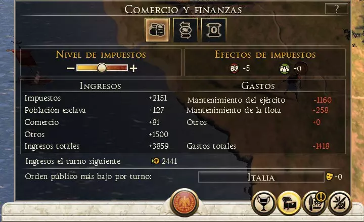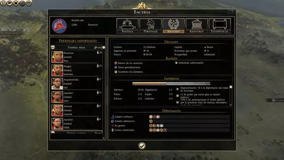 提案列表: 支付:改善派系间的外交关系,使我方提案更具吸引力。 军事通行:允许我方军队通过其领土,且不会产生任何外交影响。 互不侵犯条约:派系承诺互不攻击。 防御同盟:当你受到攻击时,保证获得某派系的支援。 军事同盟:允许对共同敌人发起联合攻击。 宣战:引发派系间的战争。创建附庸国:一个派系成为附庸国后,附庸国需向保护国支付一定数量的金钱,且在战争时期不得拒绝协助其保护者。同时需要注意,附庸国的省份会被计入战役胜利条件。 联邦:此选项仅对蛮族部落开放。由拥有共同历史的多个部落组成联盟,其领土和军队将并入你的势力。 贸易协定:在派系之间建立贸易路线,从而提供额外收入。 选择盟友时,我们必须特别关注忠诚度。忠诚度越高,该派系背叛我们的可能性就越低。因此,理想的做法是与忠诚度最高的派系建立联盟。 我们必须记住,建立有利外交关系的最佳方式是军队的力量,也就是说,一个派系的军队越强大,就越容易达成协议。 附庸国与邦联 要建立附庸国,我们有两种选择:一是攻击该派系,使其极度虚弱,然后提议他们成为附庸国;二是与该派系保持极好的外交关系,并且双方的力量平衡对我方极为有利,这样他们才会接受。派系越虚弱,他们成为我们附庸国的可能性就越大。说服一个部落加入我们的邦联,其方式与建立附庸国相同。 战略资源 我们必须通过征服和贸易,尝试获取游戏中的所有类型战略资源,这将使我们能够建造更高级别的建筑。 内政 在《全面战争:罗马2 帝皇版》中,国家政策是构成国家的各个家族之间持续的权力斗争。 界面 我们可以通过点击地图底部中央的派系图标(5号键)来访问,在此窗口中我们可以查看有关我们派系的信息。