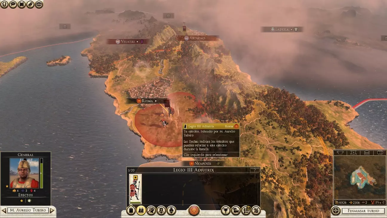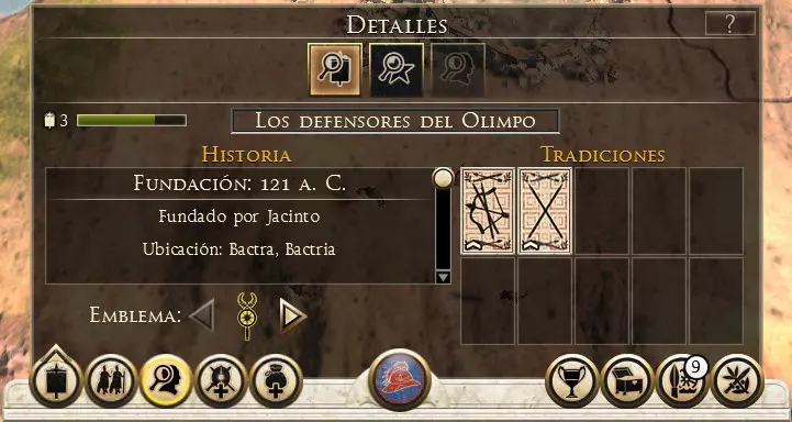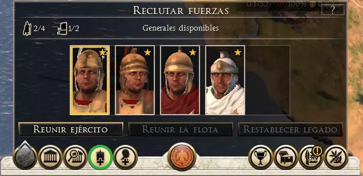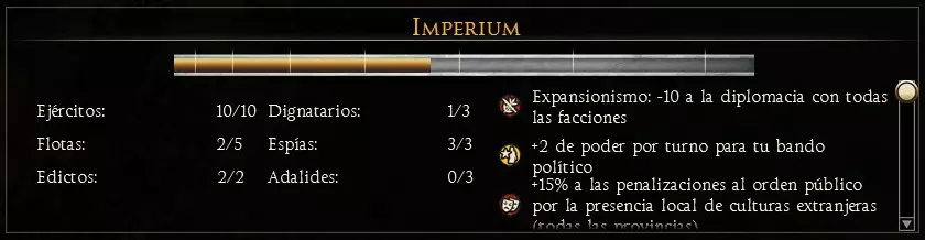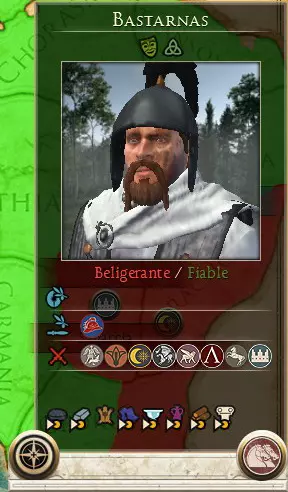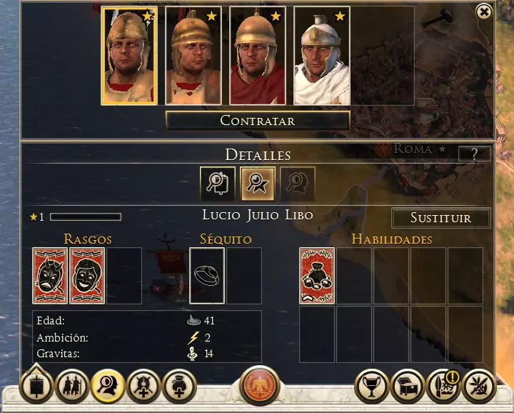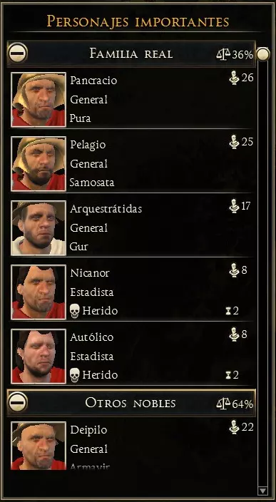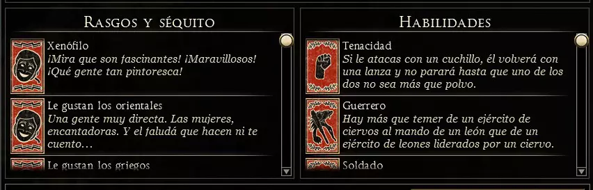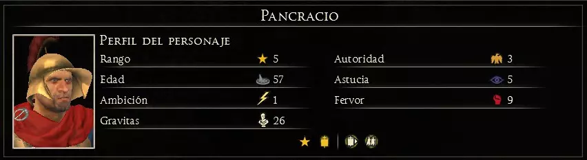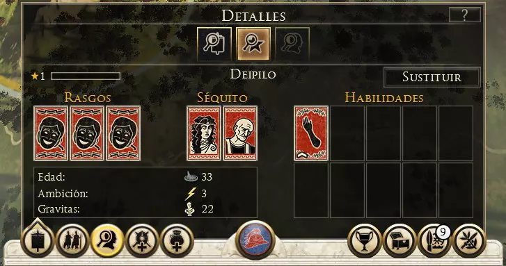 可用信息: 经验等级,每提升一级可解锁一项新技能。通过参与战斗获取经验。 特质,包含角色性格和职位相关信息。 随从,在游戏过程中,会有不同的人物、物品和角色加入队伍,为玩家提供额外属性;若将领有配偶,也可在此找到相关信息。 技能,已习得的技能。 年龄,将领的年龄,会随着回合推进增长,直至将领死亡。 野心与声望,显示将领在帝国政治中的影响力。 此外,屏幕左下角还有一个显示额外信息的面板。