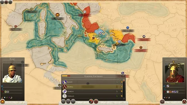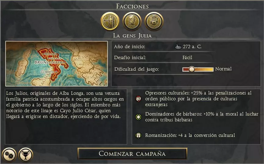一旦确定了你想要游玩的文明,就需要选择一个特定的派系。这个选择不仅会影响你在世界地图上的初始位置,还会影响你派系的固有优势和劣势。以罗马或迦太基为例,无论选择哪个家族,游戏开始时你拥有的省份都是相同的。你选择的家族或王朝会影响游戏方式,而其他政治派系则会出现在元老院。