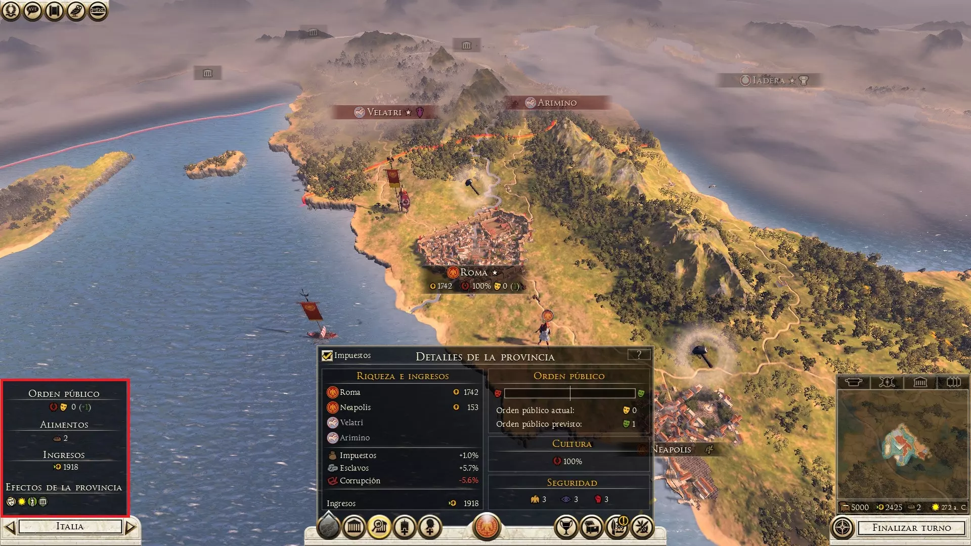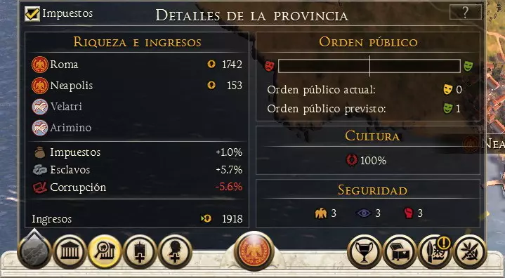 如果你至少控制着该省份的一个定居点,屏幕左上角会显示一条发展进度条,这代表可分配的人口盈余,可将其导向任意定居点以扩大城市规模。 现在我们来查看省份详情(按2键),其中包含以下内容: 【财富与收入】:可查看该省份的收入金额,以及税率、奴隶数量和腐败率。 【公共秩序】:衡量该省份居民的满意度。税率和奴隶数量会影响公共秩序,此外,代理人、建筑、已研发科技以及其他文化也可能对其产生影响。文化:显示该省份中所有文化的影响力。 安全:显示该省份对敌方特工攻击的抵抗能力,数值越高,敌方特工成功的可能性越低。 税收(左上角):可以取消该特定省份的税收,从而提高公共秩序。