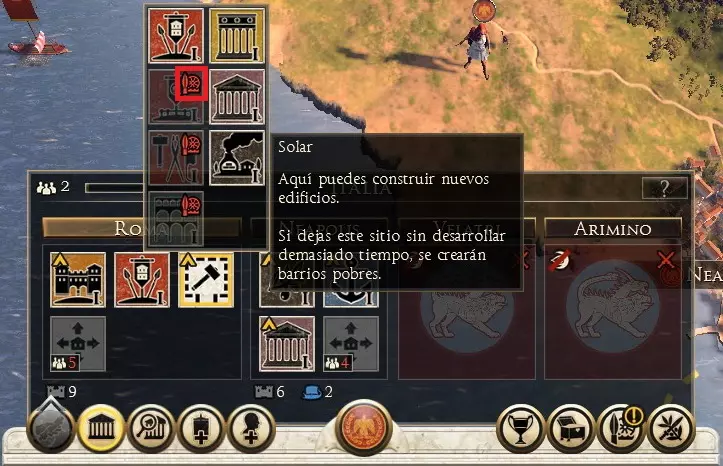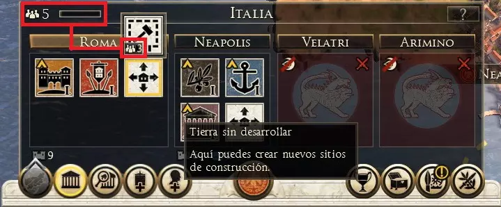 我们必须注意,如果帝国拥有多余的食物,过剩的食物将分配到所有省份。当我们生产的食物少于帝国消耗的食物时,问题就开始出现。在这种情况下,那些进口食物且领土上有军队的省份将开始损失士兵,人口也会开始死亡,因此,建议省份实现自给自足。 扩张与发展 选择省份中的任何定居点后,我们可以开始对其进行扩张。为了增加定居点的规模并添加新建筑,我们必须拥有足够的过剩人口。