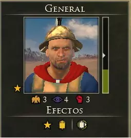 其属性包括:权威、狡诈和狂热。 等级(星级)。 军队移动点(绿色条)。 效果,影响将领及其指挥的军队。 技能树