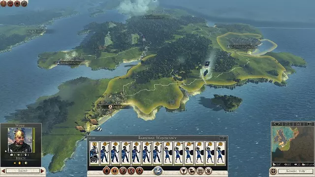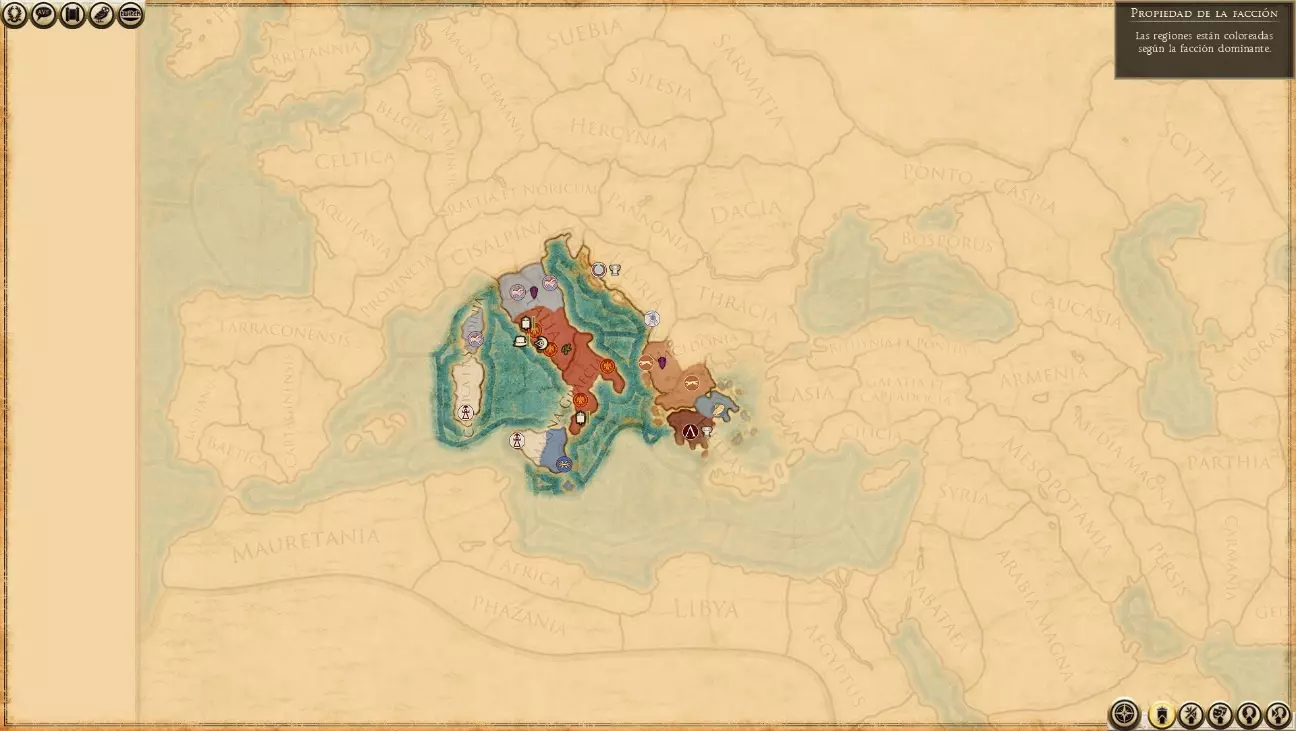 现在只需通过滑动条选择游戏难度,然后开始战役即可。 界面(战略地图) 开始游戏后,你可以看到战役地图,在战役地图中还能找到战略视图,位于右下角结束回合按钮旁边(标签页)。古老的世界被划分为数十个省份,这些省份又进一步分为更小的区域。每个区域由一个主要定居点和一个或多个次要定居点组成。