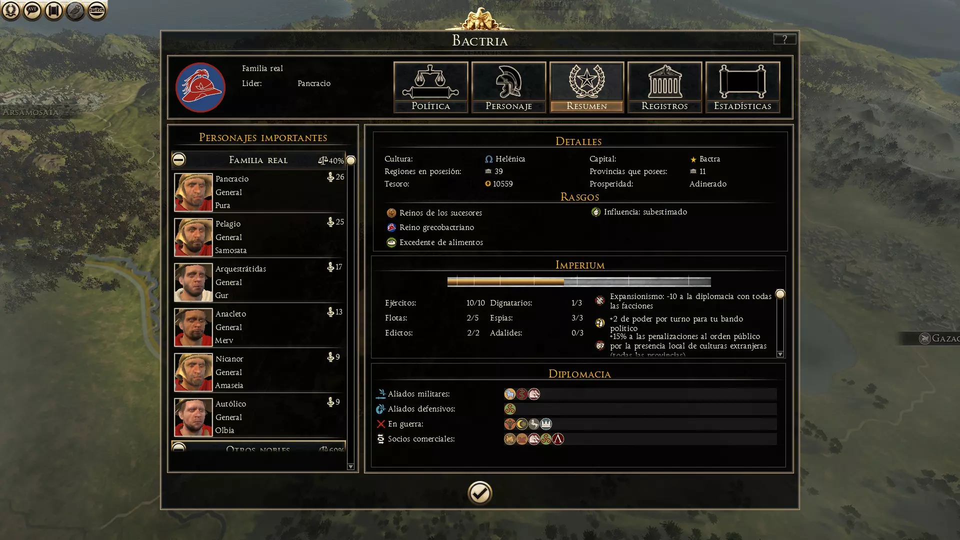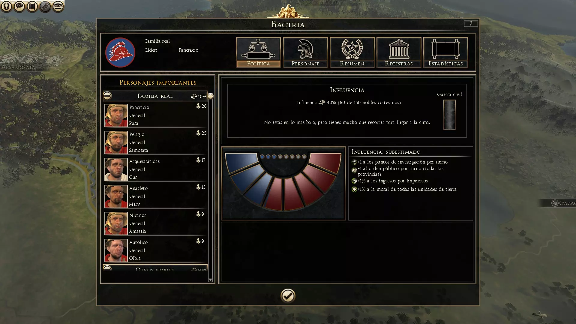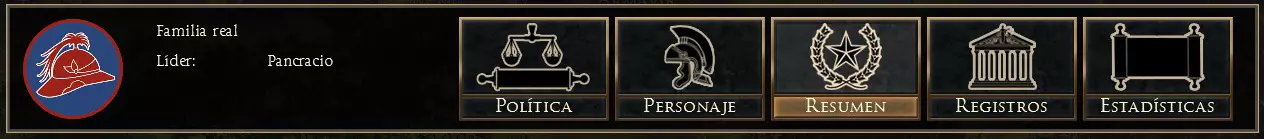 此窗口分为多个部分:政治、人物、摘要、记录和统计。在左侧,我们还可以看到构成派系政治的不同家族的重要人物。