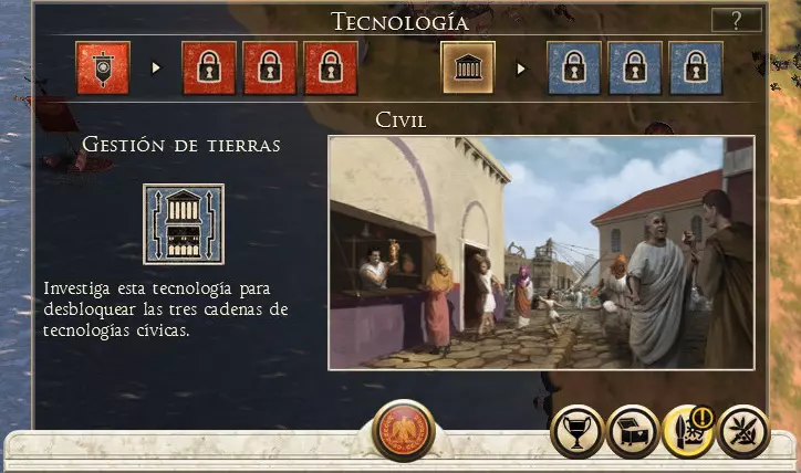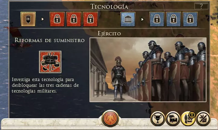 科技 在《全面战争:罗马2 帝皇版》中,每个派系都有自己的科技树,我们可以通过点击中央底部的长矛和齿轮图标(8键)来访问它。可以看到研究分为社会和军事两个方向。