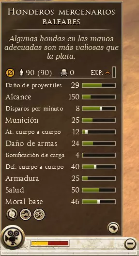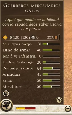 它由以下部分组成: 当前部队数量(士兵最大数量),伤亡人数越少,部队的效能越高。 消灭敌人数量。 经验值,经验值越高,部队越强。 projectile damage,投射物造成的伤害。 射程,投射物可发射的最大距离。 每分钟射击次数,投射物的发射速度。 弹药量,剩余可发射的投射物数量,耗尽后部队将进行近战攻击。 近战攻击,部队在近战中造成的伤害。 武器伤害,近战攻击的伤害量。 冲锋加成,部队冲锋时的伤害能力。近战防御:近战中规避敌人攻击的能力。 护甲:单位的护甲防御能力。 生命值:部队的生命值。 基础士气:单位士气越高,其撤退的概率越低。 技能(图标):每个单位在战斗中都拥有特定的技能,将鼠标移至技能图标上可查看详细信息。 技能:游戏中的将军及大多数单位都拥有多种技能,例如燃烧弹、特殊阵型、临时攻击力提升等。