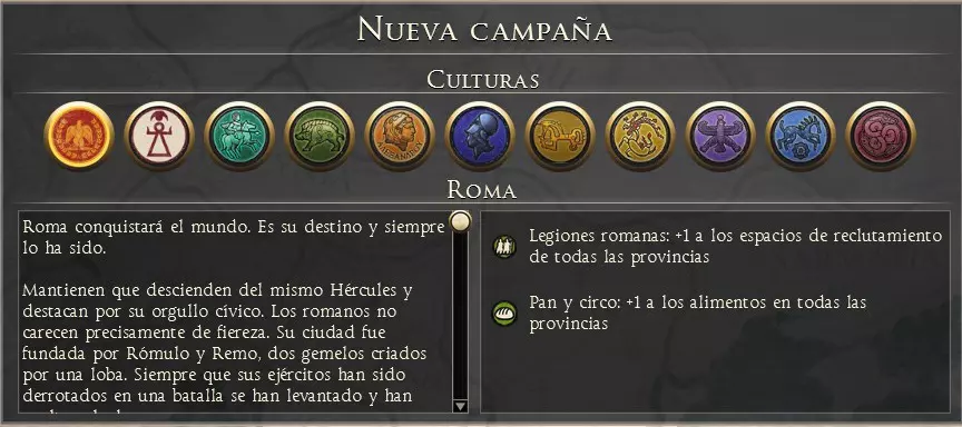 序章 建议从序章开始游戏。这是一个迷你战役,能让我们熟悉游戏的战术和战略控制方式,包含3个部分,将指导我们如何游玩【全面战争:罗马2 帝皇版】。 新战役 选择【宏大战役】选项后,我们需要做出游戏中最重要的决定,即选择要带领哪个派系走向胜利。派系按不同文化分组。