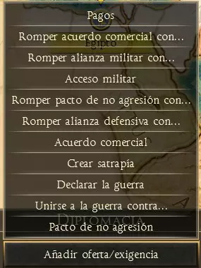 外交对话 双击后,我们可以点击添加提议/要求按钮开始谈判,随后会出现一个下拉菜单,其中包含可用选项。根据两派之间的力量平衡以及我们与他们的关系,我们的提议可能会被接受或拒绝。