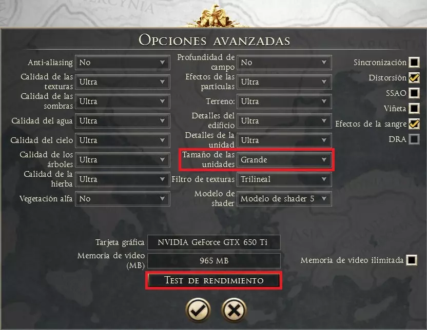 第一个选项可以增加每个单位的士兵数量。将其调整为超高时,最大规模的单位将包含160名士兵。战场上的士兵数量将从数百人增加到数千人,战斗会更加激动人心。 性能测试功能可以让你测试图形设置。你将观看几分钟的动画,之后会获得电脑的性能信息。如果无法正常观看性能测试的图像序列,建议降低图形设置,以获得更流畅的游戏体验。