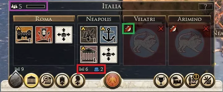 选择任意定居点后,你会在中央底部看到一个省份管理面板。最大的定居点(最左侧)始终是该省份的首府,其余则为次级定居点。 你控制的定居点会始终显示现有建筑列表。中立定居点的背景为灰色,敌方控制的定居点背景为红色。如果我们的间谍位于敌方或中立定居点的领土内,我们可以访问情报部分(将光标放在左上角的眼睛图标上)。此外,在属于你的派系的每个定居点,你都可以看到堡垒和船只的图标,这些图标【显示了当地驻军的兵力数量】(将鼠标悬停在它们上方即可查看)。