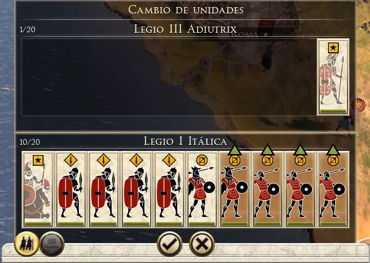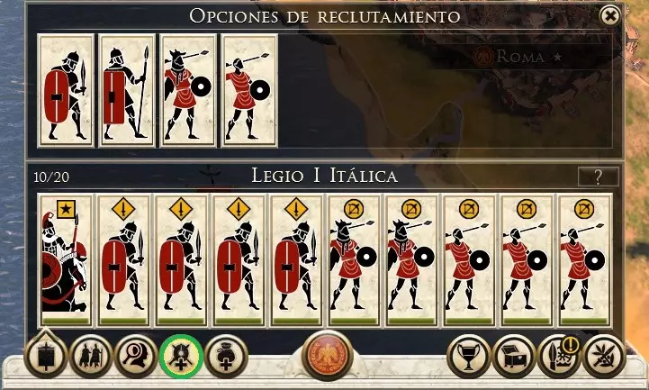 在屏幕中央部分,我们可以找到军队面板,在该面板中能看到我们军队的所有单位。如果我们还有海军舰队或定居点中的固定炮兵单位,屏幕右上角会出现一个按钮。在单位下方,我们可以看到多个用于向单位下达命令的图标,下面将从左到右对这些按钮进行说明。 移动速度切换(快捷键R):单位移动速度加快,但会更快疲劳。 近战模式(快捷键F):远程单位停止使用投射武器,切换为近战攻击。 停止(快捷键退格键):使单位停止行动。【群组控制】:选择多个单位后,此按钮将被激活,允许我们整体移动所有已选单位。 【阵型】:提供多种阵型供选择。