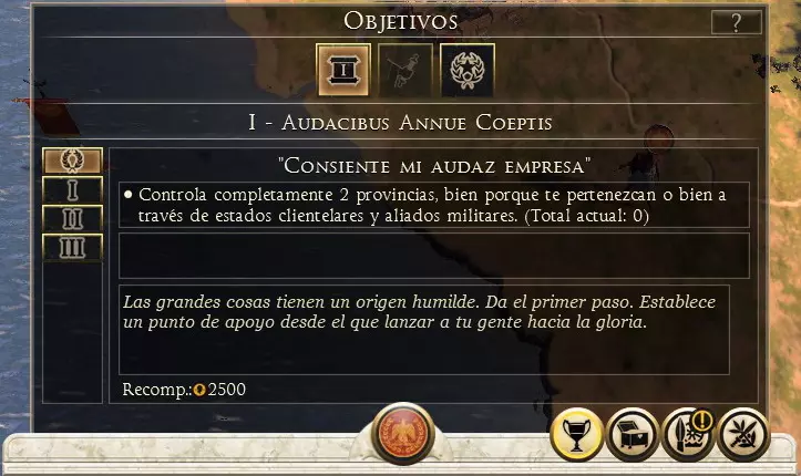 省份扩张 由于每个派系在战役地图上的起始位置不同,且每个文明都有其独特之处,因此几乎不可能提供一个具体的方法,所以这里将介绍一些关于该主题的基本概念。 首要目标应该是在中央省份建造军事建筑(中央省份是指能在短时间内到达帝国任何地方的省份)。这将使我们在军事上比邻国更具优势。游戏刚开始时,拥有比对手更先进的部队是很有利的,这样可以确保快速的领土扩张。在开始入侵之前,建议在帝国内储备足够的食物,以确保在获得新领土后不会出现短缺。以下是管理我们不断扩张的帝国的行省系统的一些指导方针: 1. 在游戏的第一阶段,我们应该专注于军事和农业建筑。 2. 征服多个邻近地区后,理想的做法是将帝国中心转变为食品生产中心(建造圣地以维持公共秩序),并将军事建筑迁移到冲突地区。 3. 始终保持食物过剩,以便能够同时维持多个被征服地区。理想的做法是建造神庙,以扩大我们帝国文化的传播,从而增强新征服地区的公共秩序。建议使用高官和勇士来加强文化宣传。 对于拥有众多码头的省份,理想的做法是通过建造港口来增加帝国的财政资源。 目标与任务 你可以通过点击中央下方的奖杯(6键)来查看目标和任务。在这里我们可以找到所有已分配的任务,包括用于完成战役的主线任务,以及能为我们带来各种好处的支线任务,这些好处可能是经济收益,或是能改善经济、提升特工行动等的短期优势等等。