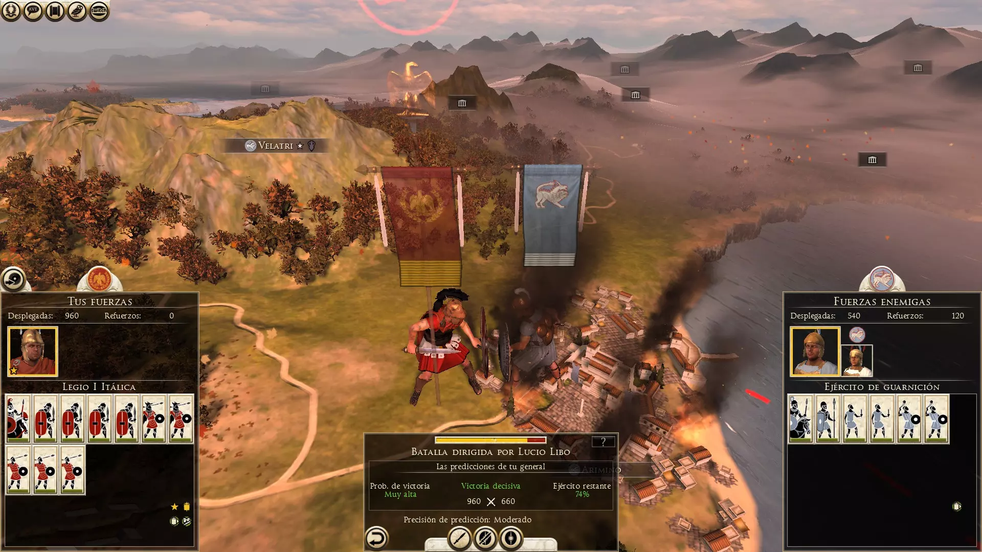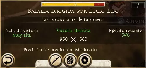 如果我们选择屏幕底部的自动解决战斗选项,将会出现三个军队态度选项,这些选项会提供不同的胜负概率。