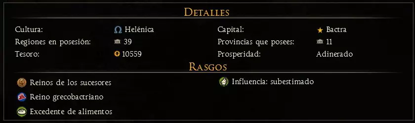 在详情与特性部分,我们可以查看文化详情、拥有的地区、宝藏、首都、所属省份以及繁荣度。在其下方,我们可以看到定义我方派系的特性,以及随机事件带来的临时加成。