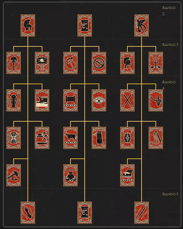 最大的旗帜代表舰队实力,最小的旗帜代表陆军实力。 地面单位 长矛步兵,这类单位通常拥有多种特殊技能,使其能在战场上快速移动,并且对骑兵有加成。 长枪步兵,这类单位装备长枪,在近战中具有优势,但由于这种步兵的阵型类型,其机动性较低,因此侧翼容易受到攻击。 近战步兵,这些单位装备近战武器。它们的特点是拥有最佳的攻击技能和造成最大伤害,因此通常用于突破敌人防线。 远程步兵,这些步兵单位配备远程武器,用于通过持续攻击骚扰敌人。这类单位的缺点是缺乏良好的防护,并且非常容易受到骑兵冲锋的攻击,这类单位应作为步兵单位的支援使用。 近战骑兵,是轻甲骑兵单位,更多地作为辅助骑兵,对远程步兵和轻步兵有效。冲击骑兵,这类单位用于消灭重步兵单位。 投射骑兵,这类单位和投射步兵一样,拥有较少的近战防御和攻击能力,但凭借其出色的机动性,是攻击步兵无防护侧翼的理想单位。 战车,是装甲骑兵单位,有助于突破敌方单位的阵型,但由于士兵数量较少,容易受到近战攻击,因此这类单位的最佳使用方式是进行冲锋后立即撤退,以便再次冲锋。大象,这种单位的使用方式与战车非常相似,但它们极易受到投射武器的攻击。 野战炮,这类单位用于发射重型投射物,能在战场上造成巨大破坏,相反,这类单位的机动性极差,因此必须保护它们免受敌方单位的攻击。 海军单位 近战战船,这种船只用于攻击敌方船只并进行甲板战斗。 投射战船,这是一种配备投射武器和轻型步兵的船只。炮兵舰,这类舰艇配备了具有超远射程和毁灭性攻击力的炮兵单位。 运输舰,是最脆弱的舰艇,负责运输地面部队。 特殊单位 军犬,是拥有极高速度和机动性的特殊单位。 亲卫队,是一小队负责保护将军的精锐士兵。 角色 游戏中有4种角色类型,分别是将军和海军上将,他们是军队和舰队的指挥官。接下来我们会遇到3种特工:权贵、间谍和勇士。这些角色具有三种属性:权威、狡诈和狂热。他们拥有的属性决定了其执行各项行动时的效率高低。 由于每个特工的初始属性各不相同,因此我们要注意:间谍对勇士有效,勇士对权贵有效,相应地,权贵对间谍有效。 此外,这些属性还为所有角色提供额外能力: - 权威:降低行动成本 - 狡诈:增加地图视野范围 - 狂热:提高在自卫时击伤敌方特工的概率角色通过执行行动(特工)或赢得战斗(将领)来提升等级,从而逐步解锁每个角色特有的属性树,为其提供优势和增益。 勇士 这类角色的主要属性为狂热。