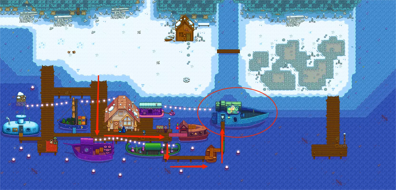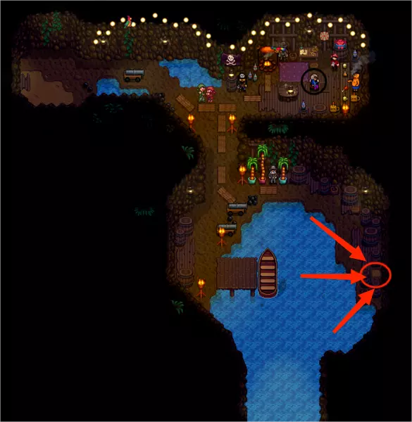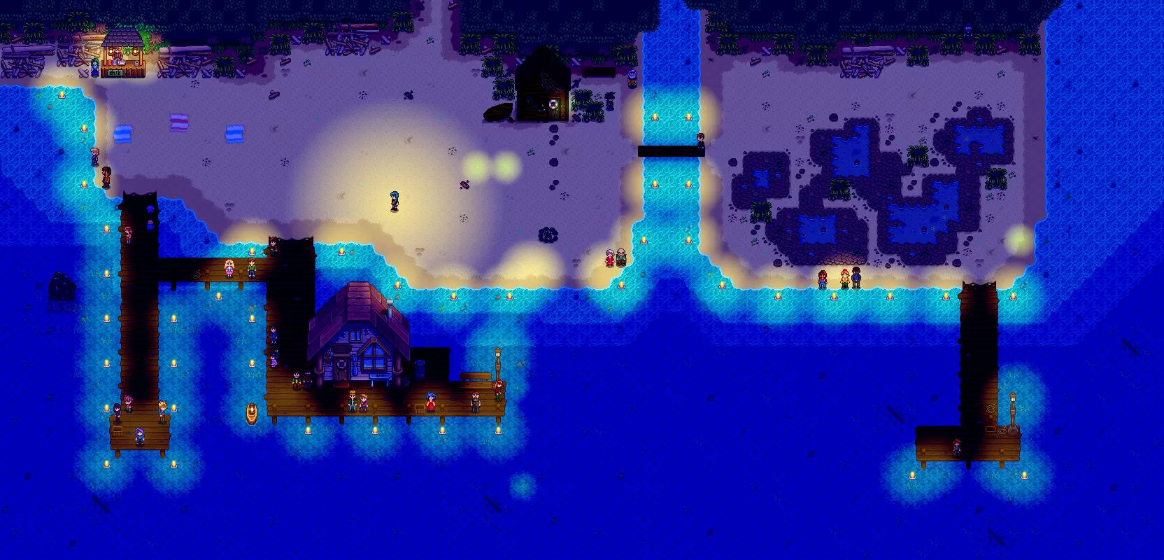 特别节日:夜市 夜市在每年冬季15日到17日于沙滩举行,玩家需在当日下午5点参加。夜市提供限量免费咖啡,还有美人鱼演出可观看。现场有油画、旅行货车、魔法商船、农场装饰售卖船等摊位,将连续开张三天。最重要的是,玩家可在最左边支付1000块乘坐潜水艇前往深海垂钓,能钓到午夜鱿鱼、幽灵鱼、水滴鱼、珍珠海参、大海参、章鱼,在中心区域还可钓到金星品质的鱼。玩家也可在鱼店门口支付250块直接回家。 秘密纸条15的提示与最右边的美人鱼跳舞有关,玩家会获得礼物(未获得纸条也有效)——在美人鱼秀场地内,依次与从左数第1、5、4、2、3个贝壳互动,即可获得珍珠。