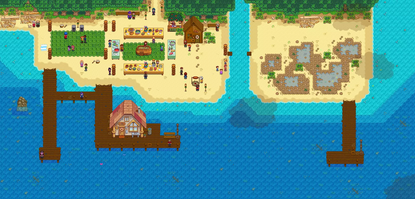 夏威夷宴会:在每年夏天的11日举行,玩家需要在当日上午9点—下午2点前往沙滩参加夏威夷宴会。玩家可将携带的食物放入汤中,州长和镇长会根据玩家提供的食材做出不同反应。最终结果将导致你与所有村民的好感度增加、减少或保持不变。