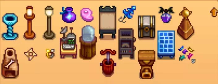 和20个火山晶石。可以对除了镰刀以外的武器或工具进行附魔,以使其获得一个带有特殊加成效果的词条(对已附魔的武器/工具再次附魔就会随机刷新该词条)。被附魔过的工具被送去铁匠铺升级后,其词条能被继承。工具的附魔: 镐: - 省力(不消耗体力) - 强力(镐等级+1) - 迅捷(挥舞速度+33%) 斧: - 省力(不消耗体力) - 强力(斧等级+2) - 木屑(有概率使砍树/树桩时额外获得3个木材/硬木;砍伐巨大作物时有概率增加收获) - 迅捷(挥舞速度+33%) 鱼竿: - 自动钓起 - 省力(不消耗体力) - 精通(手持鱼竿时钓鱼等级+1) - 耐用(50%概率不消耗鱼饵、渔具耐久) 锄头: - 考古学家(锄远古斑点时获得古物概率翻倍) - 省力(不消耗体力) - 丰富(锄远古斑点时50%概率双倍收)获;范围(最大蓄力范围增大至5x5矩形区域);迅捷(挥舞速度+33%)喷壶无底洞(无限浇水);省力(不消耗体力);范围(最大蓄力范围增大至5x5矩形区域)淘盘考古学家(有概率额外获得1份相当于在当前区域锄远古斑点可获得的物品);丰富(增加矿石获得数量);捕鱼(小概率获得1条该水域可钓起的鱼);范围(使用范围扩大)武器的附魔有两种词条(弹弓类武器不能附魔),一种用五彩碎片,一种用龙牙