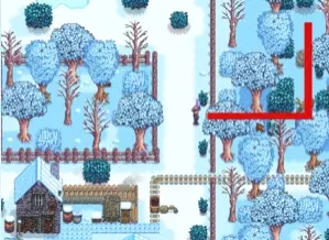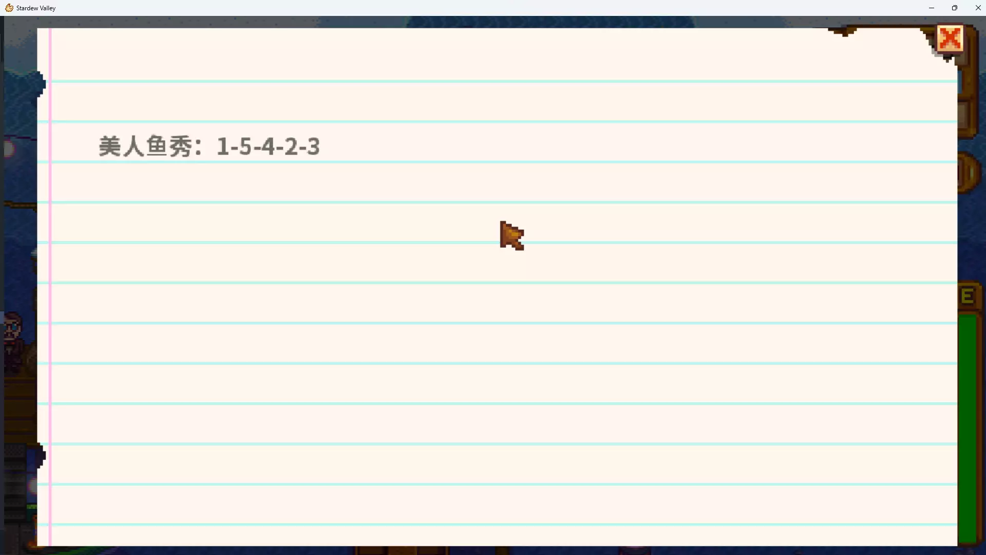 秘密纸条#25可在铁路区域西南方的温泉屋外侧小水池钓到阿比盖尔的项链(冬季无法进行,操作方式如图所示)。