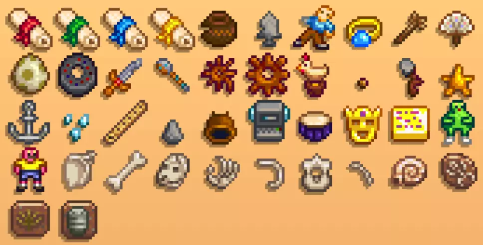 (火山地牢中龙骨层找到、熔岩潜伏怪15%概率掉落)进行附魔,二者可以同时生效、叠加。不过,用宝石强化过的武器、高于15级的武器无法使用龙牙进行附魔。龙牙附魔有概率同时获得两个词条。 巧妙(五彩碎片):特技冷却减半(可与战斗10级职业技能【特技者】的特技冷却减半叠加为-75%) 虫子杀手(五彩碎片):对虫类敌怪伤害翻倍;可击杀甲虫(骷髅洞穴里那些杀不死的飞虫) 十字军(五彩碎片):对木乃伊、幽灵、骷髅、小黑人类的敌怪伤害翻倍;击杀的木乃伊不会复活 吸血鬼(五彩碎片):攻击有9%概率为玩家回血,回血量为受击怪物最大血量的9%~10%67%干草(五彩碎片):破坏杂草时有50%概率获得纤维,33%概率获得干草(若农场筒仓尚有空间则会直接收纳)。 防御(龙牙):不大于10级的武器可用,防御至少+1,至多提高【武器等级的一半+1】(但最多+5)。 重量(龙牙):击退至少-1,至多+5。 史莱姆刮泥(龙牙):击杀任意史莱姆时获得额外的史莱姆泥。 攻击(龙牙):攻击至少+1,至多提高【武器等级的一半+1】(但最多+5)。 暴击率(龙牙):暴击至少+1,至多提高【(武器等级-1)÷3】(但最多+3)。 暴击威力(龙牙):暴击伤害至少+25,至多提高【(武器等级-1)÷3×25】(但最多+75)。 速度【龙牙】至少速度+1,至多为“4-武器速度”或“武器等级-1”的值(二者取其更低者)。史莱姆专杀:【龙牙】提高33%攻击史莱姆时所造成的伤害。武器外观变更:消耗10个火山晶石可将两把武器融合,会将第二把武器的外观应用到第一把武器上,第一把武器仍然保有原先的属性和信息,第二把武器会被消耗。只能融合同类武器,弹弓无法使用本功能。强化银河武器:花费20个火山晶石、1个银河之魂以升级银河武器,每把银河武器需要升级三次(原有的附魔词条会保留)以转变为“无限武器”。手持五彩碎片走进沙漠东北处的三柱中央可获得银河剑——每个角色仅限1次,随后可在探险家公会购买其余种类的银河武器。 有一个成就是将一把银河武器用银河之魂强化满。 银河之魂的主要获取方式有二: 1. 姜岛齐先生挑战房用40齐钻交易1个; 2. 齐先生挑战任务【深处的危险】和【骷髅洞穴入侵】期间,矿井和骷髅洞穴的一些敌怪会变成【危险变种】,击杀累计50只这类危险变种后,每季最后一天可用10放射性矿锭交易1个(顺便一提,这两个任务期间矿井和骷髅洞穴中的一些敌怪也有极低概率掉落银河之魂)。 组合戒指消耗20个火山晶石,将2个不同戒指组合成1个,其兼有二者属性。同种戒指无法组合,组合获得的戒指也无法再次用于组合。 重置锻造台页面的红色【X】按钮即为重置功能。顾名思义,重置可用于重置某个武器/工具的附魔词条或强化效果,也可将组合后的戒指拆分为原先的两个戒指。但重置操作仅会返还当初投入火山晶石的50%。 ---全收集篇--- 收集品图鉴(对应游戏内第1页) 注意:本节涉及的物品,只有亲自出售过才会在收集品图鉴中被点亮! 碍于篇幅,下方已按游戏内置图鉴排序,仅简洁介绍主要获得来源!