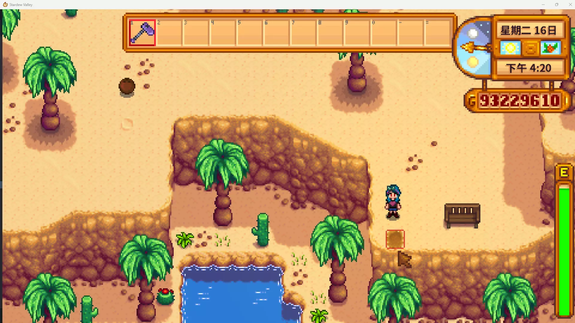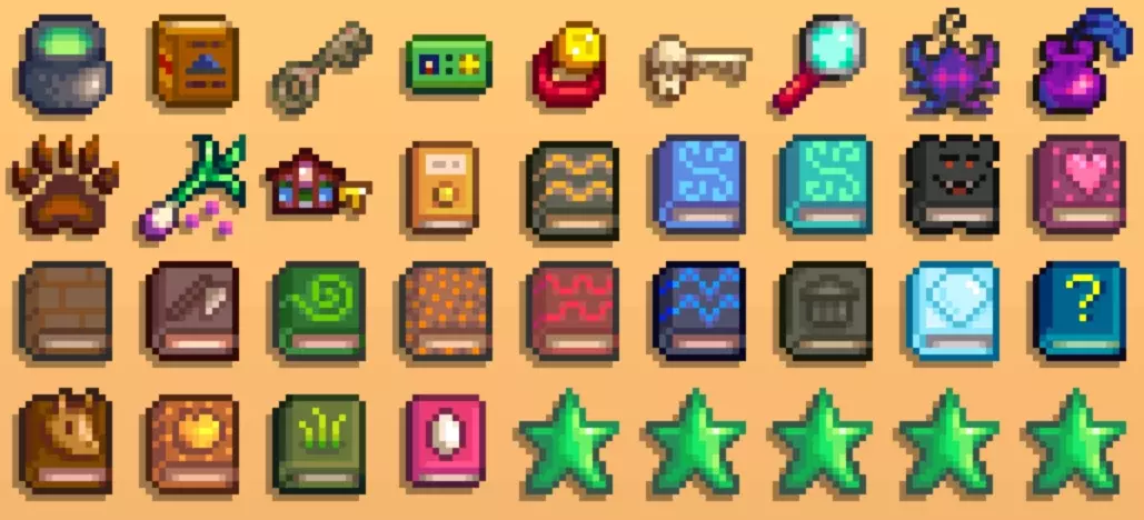战斗精通:奖励铁砧配方、迷你锻造台配方、解锁1个饰品栏。饰品是1.6版本新增,目前一共加入了8种(请自行区分饰品和原本就有的戒指),大多数都是刷怪掉落,具体请另见章节。 新人指引:卡利科沙漠之旅! 在完成金库收集包后,巴士站的巴士会被修复,之后潘姆每天都会在10:00-17:00呆在巴士站,这期间可以买票(500金)前往沙漠。 沙漠商人在沙漠区域东侧,以物易物,冬季15-17日期间会去星露谷的沙滩区域参与夜市。可以在沙漠商人处用10铱锭交易沙漠传送图腾的配方。如果想邀请《星露谷物语》下水道的NPC科罗布斯成为室友,在其友谊度达到10星时,可用200虚空精华在沙漠商人处交易虚空精华吊坠,并赠送给科罗布斯。 沙漠区域西南侧的建筑是绿洲,这里是一家杂货店,经营时间为9:00-23:50。经营者NPC桑迪同样拥有友谊度机制,在这里可以买到仙人掌、大黄、杨桃和甜菜的种子。建筑二层是赌场,需要完成【神秘的齐】系列任务才能进入。在赌场中,需将钱兑换成充当筹码的齐币(10金=1齐币,齐币无法换回成钱),可进行21点游戏和抽奖机玩法,齐币还可兑换部分物品,其中包括珍奇乌鸦8-3。赌场有个NPC可以花100万金购买无尽财富之雕像,效果是每天生成一样物品(万象晶球、矿锭或钻石,如果当天有NPC过生日则会生成该NPC最喜欢的物品)。 骷髅洞穴在《星露谷物语》的矿井探索至最深到120层可获得头骨钥匙,它可以用来进入骷髅洞穴——入口在沙漠区域的西北角。在骷髅洞穴的探索类似矿井,敌怪更难(也有矿井不会有的新敌怪种类)、无限层数、每日刷新,但它没有充当捷径的升降梯,而且能找到矿井中不会找到的铱矿(越深层越易出现),也没有固定的奖励宝箱层,有时还会有会让玩家直降若干层的竖井(会扣血)。骷髅洞穴6层之后会低概率出现一种叫【史前层】的感染层(必须清怪才会出现楼梯),其内有许多霸王喷火龙,在这还能采集到蕨菜和恐龙蛋(恐龙可以在被升级过的鸡舍中养殖)。 初次进入骷髅洞穴后会在次日接到探索骷髅洞穴至第25层的任务,完成获得10000金(初次探索骷髅洞穴就抵达25层,则会在次日直接获得奖励)。 三柱、沙之巨龙三柱在沙漠区域东北侧,手持五彩碎片走到三柱中央会获得银河剑,单个角色仅限1次。获得银河剑后,另外两种银河武器(匕首、锤)就可在探险家公会购买了。 沙之巨龙在沙漠区域西侧,与【神秘的齐】系列任务有关。 【神秘的齐】系列任务1.带上1个电池组从巴士站一路向西走进入隧道,在隧道区域(如果环境过暗可以放置照明物)找到一个加密箱,并放入电池组,以此开启系列任务。 2.将10个甜菜放入镇长刘易斯家的冰箱里。 3.带上1个日光精华前往沙漠,并将日光精华放入沙之巨龙的头骨中。 4.在自己家门旁的木柴堆找到会员卡,至此赌场可以进去了。 新人指引:姜岛间乐,不思星露谷也! 首先是如何开通姜岛。 开通姜岛:有两种方法:1.修复社区中心。2.完成Joja社区发展申请书。 完成以上其一之后,第二天就会收到威利(渔夫)的邮件,之后前往鱼店的后门花费材料就可以修复旧船了。需要的材料可以提前准备以免浪费时间。(如下)