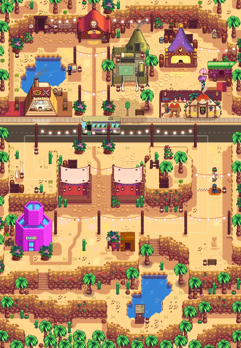 1.6版本新增三个节日: 1. 沙漠节:每年春季15-17日10:00在沙漠区域开始(需先解锁沙漠区域),为开放性节日(类似夜市不锁定场地)。主要内容为通过一系列小游戏获取卡利科三花蛋,用于在节日商店兑换物品。每个NPC都有独特任务或商店,任务多为通过特定方式获取三花蛋,部分NPC会提问关于星露谷的问题,答对可获得50个三花蛋。节日商店物品丰富,需要大量三花蛋兑换。