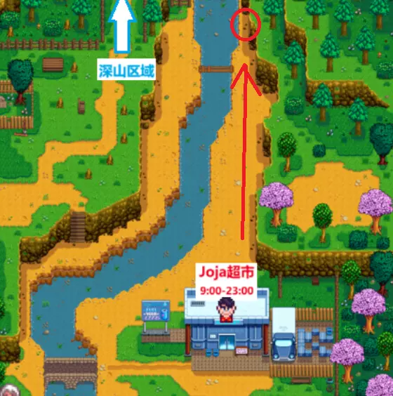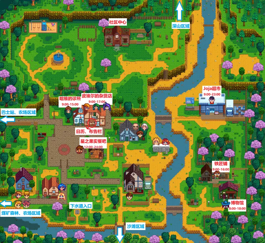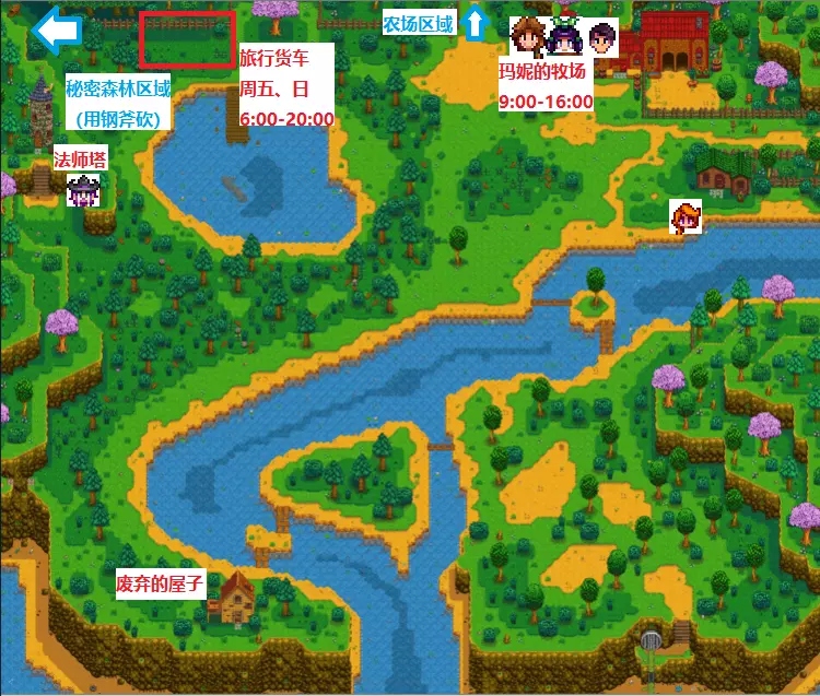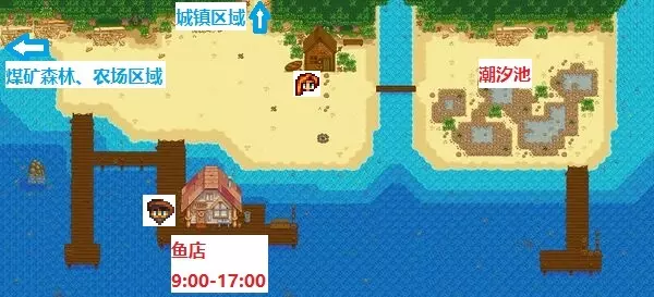 玛妮的牧场周一、周二打烊,出售各种畜牧幼崽(需要先建好满足饲养条件的场地才能购买)和畜牧业用品。 法师塔每天23:00前开放。在第1年春季第5日后,初次在晴天8:00-13:00进入社区中心时会触发过场剧情。与社区中心内的发光方块互动后,次日会收到前往法师塔的信件,之后即可前往法师塔(法师会使玩家听得懂祝尼魔的语言,并由此开启社区收集包任务)。法师有一些相关任务,与星露谷许多隐藏地区的开启有关(需要完成修复社区中心),其中包括突变虫穴、女巫沼泽、女巫小屋。抵达女巫小屋并找回法师的魔法墨水后,可以在法师塔内的魔法书处建造一些魔法建筑(立即完成),这包括提供无限次单向传送功能的各种图腾柱、帮忙进行附近大范围农业收获的祝尼魔小屋、阻止农场区域生成杂物和防止围栏损坏的黄金时钟。这些魔法建筑是游戏达成【100%完成度】的条件之一。法师塔有一个地下室可以进行角色初始信息修改(外表、性别、名字、最喜欢的物品、宠物形象等),与法师的友谊度达到4心后可直接从法师塔进入,也可以从女巫小屋进入。秘密森林入口位于煤矿森林区域的最西北角,挡路的木头需要使用至少升级至钢斧的斧头才能砍掉。森林内有一些史莱姆和应季采集物,其中春季的羊肚菌、夏季的蕨菜、秋季的鸡油菌是前期基本只能在此找到的采集物。每天还会刷新许多大树桩,因此这里是硬木的主要来源。 秘密森林区域内有一个名为【老坎诺利大师】的雕像,在秋季种植稀有种子(每周五、日可多逛旅行货车,春、夏季更容易出现)获得宝石甜莓后,将其交给雕像即可获得1颗星之果实。另外,如果一些特殊的、仅可获得一次的物品被玩家因某些原因永久遗失(比如NPC好感度奖励的家具等),在1.6.9版本更新后,秘密森林会出现一个遗失物品商店,玩家能够以10000金的价格买回物品。 旅行货车每周五、日出现,出售物品种类随机性很强,价格也相对较贵,但它能确保帮助玩家【在第1年内拿到所有第1年内无法通过常规途径入手的社区收集包素材】,比如红叶卷心菜。一般需要专门关注旅行货车来入手的物品有稀有种子(春、夏季必定出售)、咖啡豆、珍奇稻草人8-4(秋、冬季40%概率出售)。此外在多人游戏中,还会固定出售结婚戒指的配方,这用于玩家之间的求婚(可佩戴但无加成效果,不能向NPC求婚)。6版本新增内容:在旅行货车停靠位东侧可找到一棵巨大古树。完成温室建设(即完成社区中心茶水间收集包)后,每晚有10%概率触发“大风天气”随机事件,此时巨大古树会变为大树桩。与树桩互动可接取任务,需使用100块硬木将其修复成树屋。修复后的次日,会有一只浣熊搬入并开启相关流程,具体内容请见【浣熊邻居】一节。 精通山洞是1.6版本新增内容,洞口位于煤矿森林区域森林东北方向的石壁处。玩家需将五种技能均提升至满级10级后才能解锁该山洞。在山洞内可激活五种精通(激活顺序不限)。精通经验需在五种技能均达到满级10级后开始累积,此前获取五种技能经验的方式均能提供精通经验。五种精通对应的奖励请见上一节【新人指引:五种技能一览】。 废弃的屋子在初次达成任意1个游戏内置成就时开店,出售各种帽子。每多获得1个成就,都会新开放出售1种帽子。在游戏中春季的复活节、冬季的冰雪节中赢取到的帽子,也会在此开放出售。 瀑布是1.6版本新增内容,位于煤矿森林区域的最南侧,在废弃的屋子东侧。在这里朝瀑布下方水域钓鱼,有概率钓起同样是1.6版本新增的虾虎鱼(训练用鱼竿不行)。 沙滩
