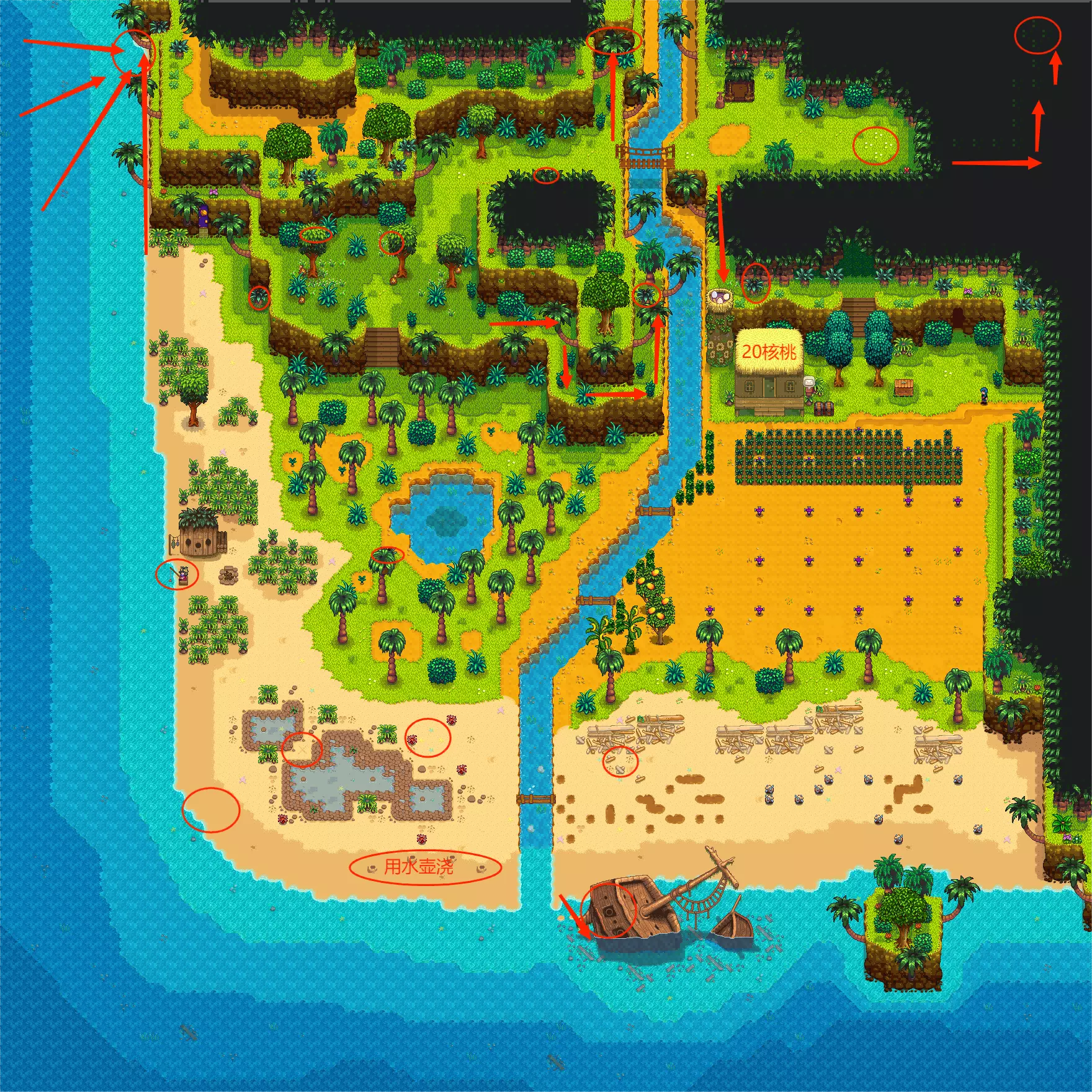 在修好旧船之后我们就可以花1000块前往姜岛了。 准备工作:我们要准备好工具,不能浪费时间和游玩体验,工具记得带上锄头、钓鱼竿、斧头、水壶、稿子、剑、弹弓(包括石头),可以带个箱子,还有传送图腾。(如果第一天没能开通农场就传送回去。) 登岛:前往姜岛之后也并不是立马就可以开始探索的,一开始会有两只巨大海龟将前往岛屿北部和西部的路堵住,玩家需要跟随出现的新NPC雷欧前往岛屿东部的丛林。 进入雷欧的小屋之后与鹦鹉对话,要给予一个金核桃才能解锁后面的区域。 进入岛屿东部之后我们将开始指引一种名为金核桃的重要道具收集。 其他 共计6个(2概率性掉落)。1. 获取金椰子(可通过蓝鸟商人购买、钓鱼、摇晃棕榈树或前往铁匠铺开启),首个金椰子必定能开出金色核桃。 2. 姜岛钓鱼。 东部:岛屿东部共有11个金色核桃。 1. 探索可获得2个。 2. 用斧子砍伐雷欧家的树可获得1个。 3. 宝石鸟解密可获得5个(该解密每个存档的内容随机,姜岛天气与醍醐镇不同,天气预报会分开播报)。 宝石鸟解密共有四个雕像,每个雕像上的图案分别对应姜岛的东部、南部、西部、北部区域。
