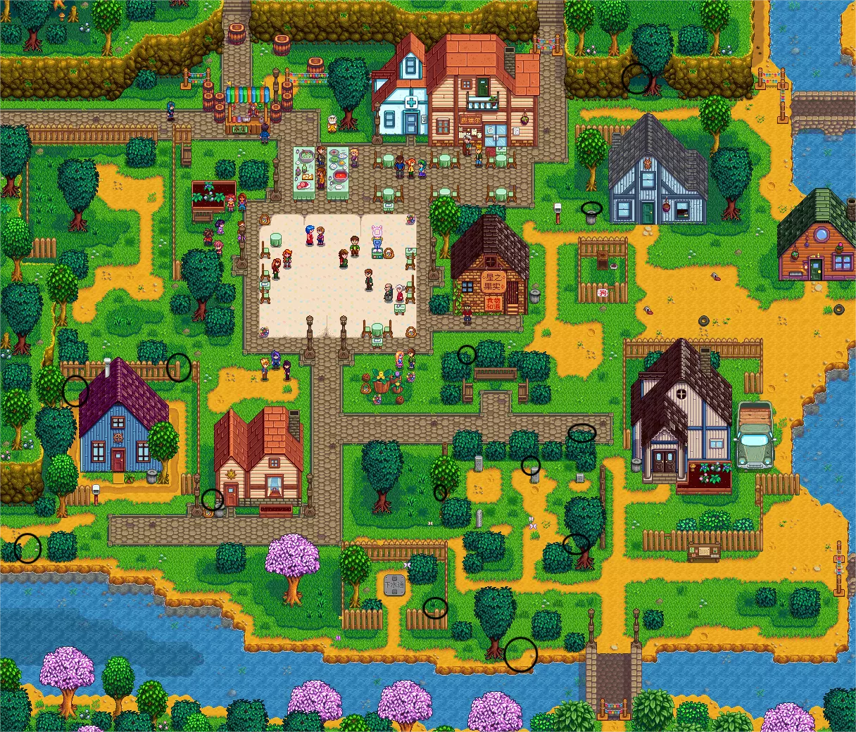 社区中心在第1年春季5日起,初次在晴天8:00-13:00进入触发过场剧情,与社区中心内的发光方块互动,次日就能收到前往法师塔的信件,法师会使玩家听得懂祝尼魔的语言,并至此开始社区收集包的任务。修复社区中心是游戏一大重要“主线”,实现其有两种途径,一个是在废弃社区中心交齐一共5个的收集包,另一个是在Joja超市花费5000金加入Joja会员并为所有社区发展项目付费,交齐单个收集包的奖励与在社区发展项目付费是一一对应的。在最终完成所有收集包前都可以加入Joja会员以另一种方式完成社区中心的修复(已完成的对应项目不再需要重复付钱),两种途径会在完成修复社区中心时解锁不同的成就。 皮埃尔的杂货店、布告栏周三打烊,出售当季种子,常驻出售各种果树种子、肥料和烹饪用品;在这里还可以花钱扩容你的物品栏,分别需要花费2000金和10000金为物品栏扩容第二、三行。在游戏后期可入手“皮埃尔丢失的存货单”,将之送回给皮埃尔可使商店常驻出售全季节种子(非当季种子会贵50%)。 店门外有日历(可查看当季节日和村民生日)和布告栏(可无限接取的随机小任务,奖励金钱和对应NPC友谊度,未完成无惩罚)。 秋季第2日起进入城镇区域时会触发过场剧情,镇长刘易斯庄园门口新建了个特别任务板,从此以后这里每周(周一刷新,不能放弃任务)可接取1个特别任务,这些特别任务是有限的,期限更长但也相对更累人,除了金钱和对应NPC友谊度外一般还会奖励一些特别的家具、配方等,建议是慢慢清完,不必担心,到期未达成的任务也可重新刷到。 哈维的诊所有人在前台时可购买能量滋补水和肌肉回复药,前者可补充大量生命和能量,后者回复量比较少但也足够解除筋疲力尽状态。绝大多数村民们每年都会有固定的某一天来这体检。 星之果实餐吧出售各种食物(有每日随机和常驻出售的)和一部分食谱,这里有游戏机“祝尼魔赛车”(需要探索矿井至最深120层获得头骨钥匙后解锁)和“草原大王的旅行”,“草原大王的旅行”通关和一命通关都分别有成就(小技巧:死了直接退出游戏机可重置当前关卡),这两个游戏初次通关后在第二天就会收信拿到游戏机,就能摆在家里玩了。 Joja超市/电影院出售的物品与皮埃尔的杂货店类似(二者是生意竞争关系),全周不打烊,但加入会员前价格会稍贵些。在触发了修复社区中心的剧情后,可以在这里找莫里斯花费5000金加入会员,通过为所有社区发展项目付费以修复社区中心,在社区发展项目付费与交齐单个收集包的奖励是一一对应的。在最终完成所有收集包前都可以加入Joja会员以另一种方式完成社区中心的修复(已完成的对应项目不再需要重复付钱),两种途径会在完成修复社区中心时解锁不同的成就。 无论以哪种方式完成社区中心修复,之后Joja超市可被建设为电影院(一样的,提交收集包或出钱),可以买票(1000金)看电影以及赠票约NPC/其它玩家一同看电影,每季轮换上映的电影,还可以买观影小零食,这些也是提升NPC友谊度的好方法,具体可以查看介绍NPC友谊度机制的章节。 铁匠铺社区中心被修复后周五会打烊,出售铜/铁/金矿石和煤炭,提供敲开晶球服务(敲1个收费25金)。更重要的是镐、斧、锄、喷壶都可在这升级(升级时带好工具在身上并需要携带5个锭),建议优先升级镐子和斧子;选择升级后需要隔1天时间才能升级完成,所以建议升级工具前规划好行程安排,比如第二天下雨时会是升级喷壶的最佳时机、第二天是节日时也通常会是升级镐、斧的最佳时机。还有背包里的垃圾桶也能升级,作用是返还一定比例被丢弃物的价值。 博物馆可以交付特别矿物和古物,每种仅需交付1个,未被交付之物品的描述会显示为“把它捐赠给博物馆会得知更多信息”。累计交付可获得各种奖励,累计交付40个和全交齐(一共95个)有成就。博物馆全交齐可获得一个星之果实。另外,累计向博物馆交付60件物品时,可获得下水道钥匙,打开通往下水道的井盖入口。 镇长的庄园刘易斯便是鹈鹕镇的镇长,这里一般只有三个功能:一是办理离婚手续服务(与书互动),其旁边的黑色书本则是提供调整联机时各玩家的收支是否各自独立计算的功能;二是提供失物招领服务(带问号标志的箱子),像是一些节日展览、特别任务交付等遗漏物品可在此取回;三是1.6版本新增的奖品机,消耗兑奖券以获得各种奖励,兑奖券通过完成各种任务和特别任务获得,奖励是随机序列(但可以提前看到接下来的三项奖励),都不重要,但需要关注《星露谷年历》和《交友导论》。 书摊1.6版本新增,每月光临两次(随机两天,全天开放),位于Joja超市/电影院的东北侧,具体哪天会光临可在皮埃尔的杂货店门外的日历处查看,光临当天会有信息提示。随机出售一些书籍(阅读后提供各种特殊能力或经验),或者也可用已有书籍交易各种物品。 下水道、突变虫穴为博物馆累计提交60件物品可获得生锈钥匙,进而可打开下水道的井盖入口。下水道中有NPC科罗布斯,会出售一些物品,其中值得关注的有星之果实(仅可购买1颗)、回程魔杖(无限、无地点限制立即传送回家)、虚空蛋(可以孵出并养殖虚空鸡了)以及若干装饰配方。有趣的是,NPC科罗布斯虽然不可求婚,但却可成为室友(需要在沙漠用200虚空精华交换虚空精华吊坠并赠送给科罗布斯),和其它已与玩家结婚的常规NPC一样也会在抵达友谊度12.5心给予玩家