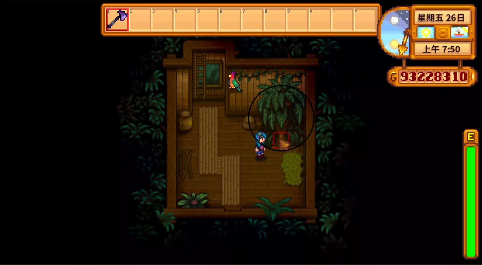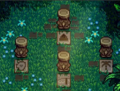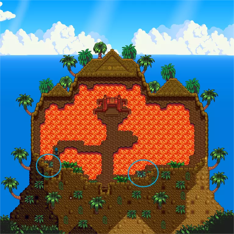 4.雷欧家左侧祭坛处放置香蕉x3【香蕉属于姜岛后期产物,香蕉果树需要28天才能产出,树苗是在解锁姜岛农场之后在姜岛北部蓝鸟商人(10个核桃解锁)处用五个龙牙(火山地牢采集或刷岩浆怪掉落)兑换或者开金椰子(砍树、挖斑点、找蓝鸟商人兑换)有概率掉落】