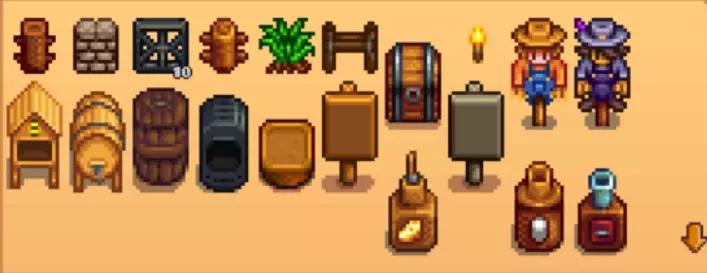 木匠的商店周二打烊,出售木材、石头以及各种家具(带随机性),还有一系列小径/地板/灯柱配方和火炬配方(火炬配方一共有8种,需要购买上一种后才能于次日解锁下一种的购买),更重要的是提供为农场打造建筑的服务(花钱加提供材料),比如鸡舍、畜棚、马厩、鱼塘、磨坊等,以及扩建房屋和升级鸡舍/畜棚的服务,一般打造建筑会需要2天左右,期间无法让罗宾进行另一个建筑的打造或升级。此外这里还提供对农场各种建筑(包括魔法建筑)进行移动和粉刷颜色的免费服务(且立即完成)。在完成社区中心修复后,还可以在这里购买1个叫“社区升级”的项目,它会将潘姆和潘妮在城镇的拖车住所替换成为崭新的屋子;完成“社区升级”项目后还可以购买捷径打通项目,其主要意义在于边远森林区域的高低侧连通、煤矿森林区域与沙滩区域的连通(还有些其它没太多存在感的捷径)。 矿井第1年春季第5日后可以进入探索,其内最深120层,分布有各种矿石和敌怪,每深入5层可永久激活升降梯捷径,每日刷新,具体可以查看对应章节以浏览矿井内的矿物、敌怪分布情况。矿井入口西侧的矿车可提供定点快速移动服务,需要完成社区中心的锅炉房收集包后解锁;东侧的挡路石头可以用炸弹或至少升级至钢镐的镐子移除,最终可找到NPC矮人,集齐四种古物“矮人卷轴”并全都提交给博物馆后可获得钱包物品“矮人语教程”,进而可听懂矮人的语言。矿井的NPC矮人会出售各种探索矿井比较实用的物品,以及珍奇乌鸦8-6、风化地板配方。获得“矮人语教程”后矿井的NPC矮人拥有友谊度机制,在拥有50点友谊度时可在下水道触发其唯一的友谊度事件。 探险家公会在矿井中探索到至少5层深后,次日会收信,击杀10只史莱姆即能进入探险家公会。其内可买到各种武器和防具,可以查看“消灭怪物目标”的进度(每完成1项都可领取奖励并使对应奖励可在探险家公会被购买,全目标完成有成就)。 采石场完成社区中心的工艺室收集包后即可修复通往采石场的桥梁,采石场区域同样也有充当快速移动点的矿车(需要完成锅炉房收集包解锁)。采石场每天都会刷一定量的石头或矿石,甚至还会自然生长出树木。虽然采石场提供了一个安全的挖矿场地,但由于采石场不会有NPC前往,所以是个完美的可利用场地,比如本指南介绍的第1年开局涉及到大量的小桶加工,这些小桶就可以放在采石场中,以节约宝贵的农场可耕种面积。 铁路第1年夏季第3天后解锁,之后每天都有概率在这里触发火车路过的事件(小心火车会撞伤),火车有不少种类,其中有些种类会在路过时留下大量可拾取物品,但相对不那么重要。这里还有个温泉,泡温泉可较快回复生命和能量;东北角处有个洞穴,通往女巫沼泽及女巫小屋,要求修复社区中心后来铁路区域触发剧情,接取并完成法师找回暗黑护身符的任务就能进入了(具体下面再介绍);达成“100%进度”后的次日可进入北侧入口抵达顶峰区域,并触发相当于游戏的结局剧情。 巫婆沼泽、女巫小屋修复社区中心后来铁路区域触发剧情,接取并完成法师找回暗黑护身符的任务(接取任务后,与下水道的科罗布斯交谈进入突变虫穴找到)就能进入铁路区域东北角处洞穴,并借助传送符文抵达巫婆沼泽了。巫婆沼泽处有个挡路哥布林,需要给它虚空蛋黄酱(就在巫婆沼泽里钓鱼可获得1个,仅限1次),随后进入女巫小屋可拿到魔法墨水(还给法师使法师塔开放购买魔法建筑),女巫小屋里的三座神龛各有作用,左侧的“私欲之黑暗神殿”可以献祭1个五彩碎片让现有的小孩消失,中间的“记忆之黑暗神殿”可以献祭30000金抹除已与玩家结婚的对象的记忆,右侧的“夜惊之黑暗神殿”可以献祭1个奇怪的小面包让怪物在夜间出没于农场(就像开局选择荒野农场所面临的情况一样,再度献祭则可阻止怪物继续出现)。从女巫小屋的传送符文可以抵达法师塔的地下室,这里有个幻觉神龛让玩家花费500金进行角色初始信息修改(外表、性别、名字、最喜欢的物品、宠物形象等)。法师若已有至少4心的友谊度则可直接从法师塔进入地下室,并可借助传送符文传送回女巫小屋。 煤矿森林