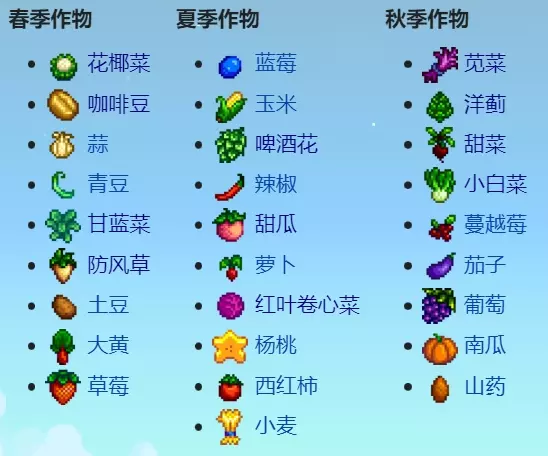 一篇指南,足够您了解到你在星露谷中有可能需要的一切信息! 随着游戏版本更新,本指南会尽快快马加鞭同步更新。目前本指南已同步更新至1.6版本。 点击此处[zh.stardewvalleywiki.com]以跳转到官方wiki页面,本指南的撰写离不开对其的参考。 食用本指南的正确方式是:1.刚起步的萌新优先看“新人指引”第一节,老手可以将本指南视为供查阅的百科;2.善用Ctrl+F进行关键词检索!(本指南对于游戏内的各物品名称都是与游戏内官中译名统一的!如果您发现了这方面的差异,请在留言区提醒!感激不尽!)3.本指南的介绍仅对纯净原版游戏负责,并且暂不打算提供模组安装方法及模组推荐,有许多其它作者dalao创作的优秀指南涵盖了这部分内容,敬请移步浏览~ 如果有修改建议请在留言区毫不犹豫地友好指出哦!求求点赞收藏打赏啦~ 祝您游戏愉快!=w= 新人指引:一个简单又不赖的第一年开局! 最最最重要的两点: 1.如果你想多人同玩(也许未来想),创建存档时请一定要从“联机-主持新游戏”创建,如果是主菜单的“创建”的存档则该存档只限定单人游玩。农场的类型选定后无法改变,对于新手而言更建议选择森林农场,能比较容易获得更多硬木和时令采集品。 2.游戏的存档动作只在睡觉并结束当天完成结算后进行。如果立即结束游戏再读档,会从当天早上6:00醒来重新开始。 总的来说,第一年的重心可以放在修复社区中心、挣钱、探索矿井上,发展NPC友谊度等其余事项建议放在第二年及之后。 如果有注意下面说的内容,你会更可能收获令人满意的第一年。准确来说,本节主要是介绍一种“啤酒+杨桃果酒”的知名、常见的致富流派,优点是易学且具有第一年就能实现财富自由的高可行性,缺点是第一年会相对更疲惫些。 全年都该注意的事项游戏一年就是4×28天,每28天就是一季(共4周,均以周一开始、周日结束)。 如果不知道本指南说的位置在哪,请参考“新人指引:星露谷不迷路”。1.家里的电视机有大用!可以获知第二日天气,每周日还能看“酱料女王”白嫖一个新菜谱(每两年一周期,每周三随机重播;建议别错过,毕竟必须先有食谱才能做对应的菜),周一和周四还可以看“离地而居”收获一个星露谷小知识。如果下雨了,当天不需要浇水,而且还可能会有特别的鱼出现。游戏内有许多不限时的任务可以无限期拖延完成(虽然挺逼死强迫症的233)。 2.矿井在小镇北侧最上方,每探索5层都可解锁充当捷径的升降梯可用层,最深120层,第一年没什么事就多下矿抵达更深层,拥有一个可以随意挑层数下矿的矿井,意味着刷怪自由和挖矿自由(笑)。矿井每天都会刷新矿物和敌怪。矿石可以搭配煤炭在熔炉处炼为锭,成为制作各种物品和升级工具的重要素材;当然矿锭和敌怪素材也是社区收集包的一部分,如果挖到钻石则更是能成为送NPC的万能礼物。下矿还可以找到许多特别矿石甚至是古物,建议优先提交给博物馆(未提交过的,其描述文字会提示玩家去提交给博物馆),像是石英、地晶等矿物还是社区收集包的一部分,有时也会成为合成材料,但大部分看起来花里胡哨的特别矿石,基本上提交过后若再获得就能当换金道具卖了。 3.升级工具在铁匠那进行,优先升级斧和镐比较合理(尤其是斧),升级工具一般要5个锭并需要2天。将斧头升级两次变成钢斧头后,就可以去旅行货车左侧砍掉一块大木头,解锁通往秘密森林的入口,秘密森林能有些独特入手物品,尤其是各种蘑菇,早开早好。升级过的斧头可以砍伐木桩,森林农场和秘密森林都会刷木桩,这是稳定的硬木来源。顺便一提沙滩右侧可以花300木头修好木桥,通往可以采集珊瑚和海胆的潮汐池,但这并不紧要。在矿井中收集到各种晶球也都拿去给铁匠敲就完事了,当然需要注意下有没闲钱,毕竟敲1个要25金。 4.尽管有些作物没法在第一年直接入手,但由于旅行货车的存在,在第一年就交齐社区收集包以修复社区中心是可行的——修复社区中心是星露谷的重要“主线”节点,每完成一个社区中心房间的所有收集包可以获得重要奖励。随机出售物品的旅行货车在周五和周日出现在玛妮牧场左侧,即农场往南再往西走(同时也是去法师塔的方向,而这再往正下方去就是煤矿森林),每周五和周日都强烈建议瞅一眼,实际上旅行货车能够“保证第一年出售过无法在第一年通过常规方式获取的作物”。所以更多情况下,你需要提前熟悉到底都有哪些物品需要提交,但尽管如此,本节指引也不强求玩家在第一年就修好社区中心,没有那种必要。 5.当你的存款有25000时,会触发剧情说洞穴生态研究啥啥的,让你选择果蝠或者蘑菇,选哪个都行,就是后续让洞穴产出可采集的水果或蘑菇,这个选择不可改变,个人更推荐选择果蝠以帮助第一年提交水果修社区,(常规的情况下,水果是要买果树种子去种,要生长一整个季节而且只能在对应季节结果),而且蘑菇什么的矿井和秘密森林都能捡。