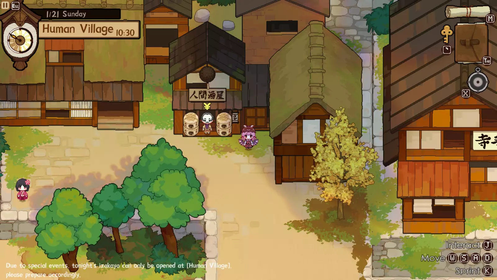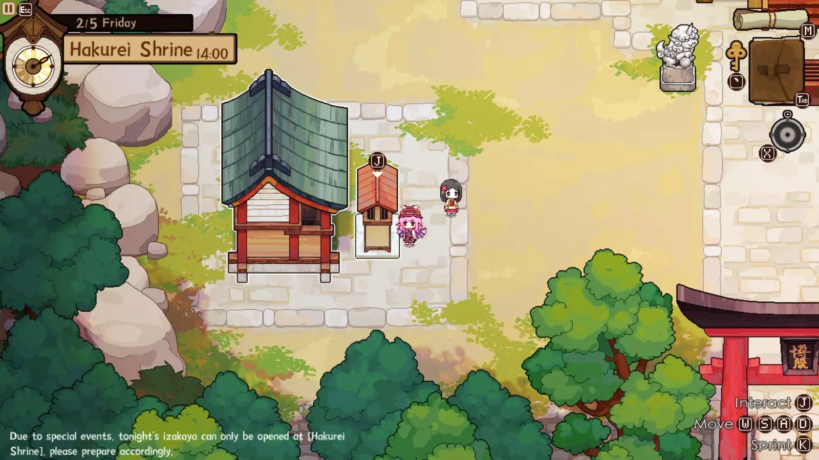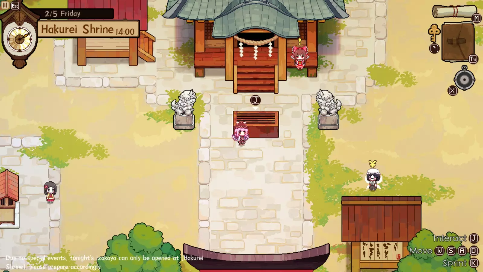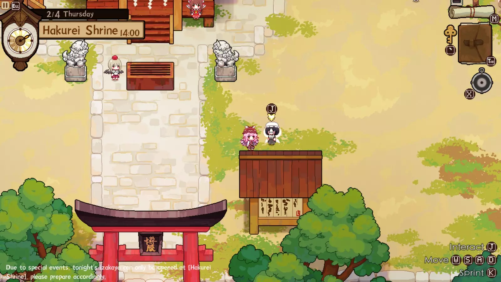 灵梦对此完全赞同,因为你的下一个目的地将是她的神社。我们正开始进入游戏中期,届时将可以通过商人获取稀有材料。如果你未能完成人类村落的任何稀有客人任务,仍可以邀请他们到博丽神社完成。在博丽神社的最初几天是强制流程,并且在第一天结束后你才能将博丽神社的居酒屋推车升级到小屋级别。尽快升级到小屋级别(第二级)是个非常好的主意,因为和之前一样,后续会有强制流程。