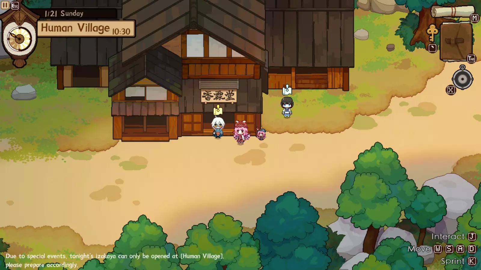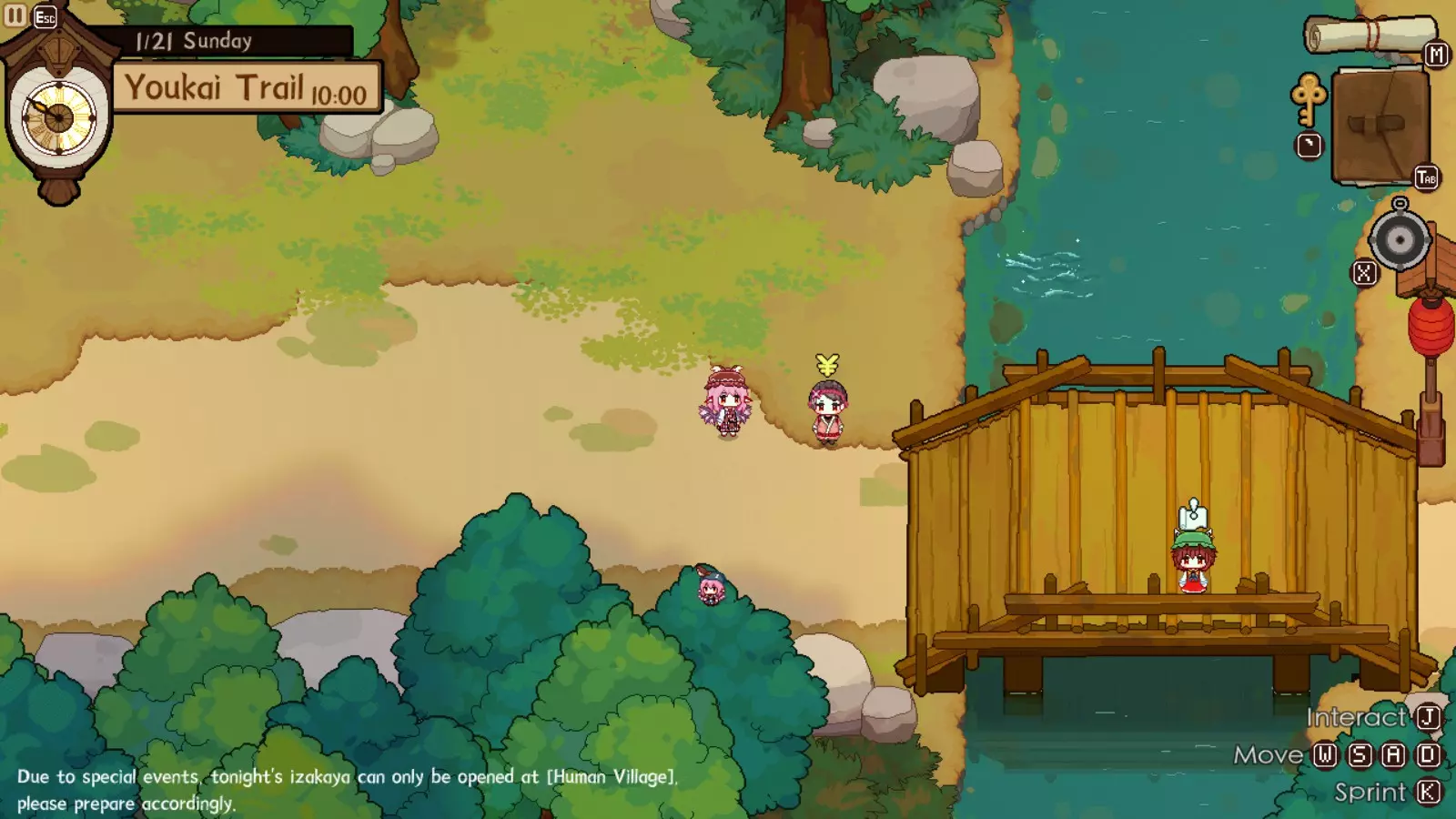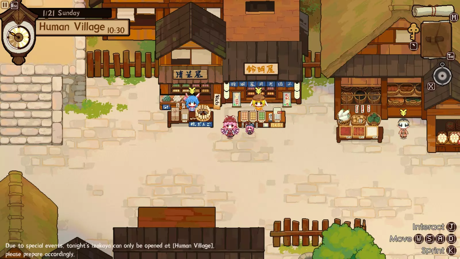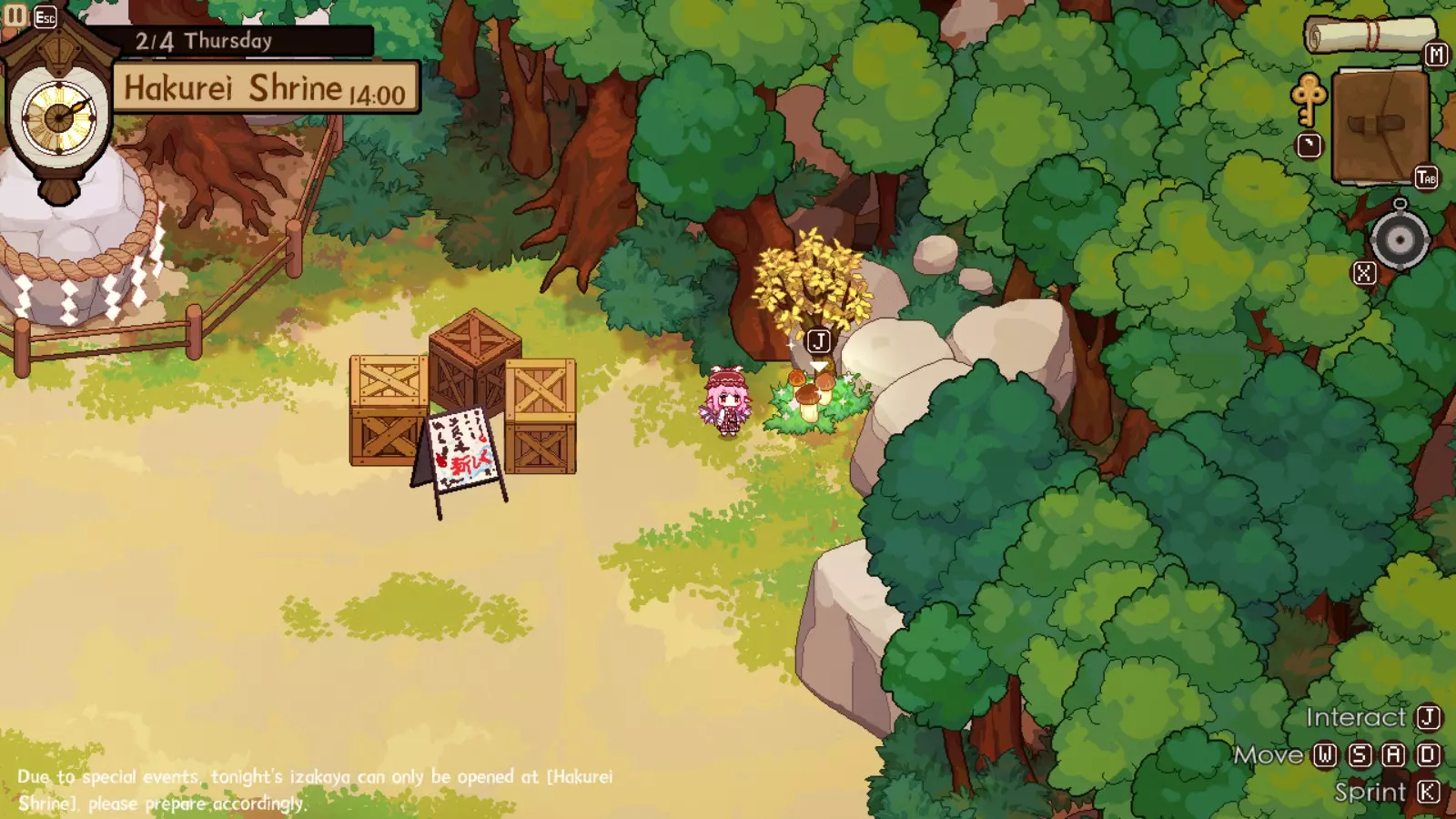灵梦对此完全赞同,因为你的下一个目的地将是她的神社。我们正开始进入游戏中期,届时将可以通过商人获取稀有材料。如果你未能完成人类村落的任何稀有客人任务,仍可以邀请他们到博丽神社完成。在博丽神社的最初几天是强制流程,并且在第一天结束后你才能将博丽神社的居酒屋推车升级到小屋级别。尽快升级到小屋级别(第二级)是个非常好的主意,因为和之前一样,后续会有强制流程。