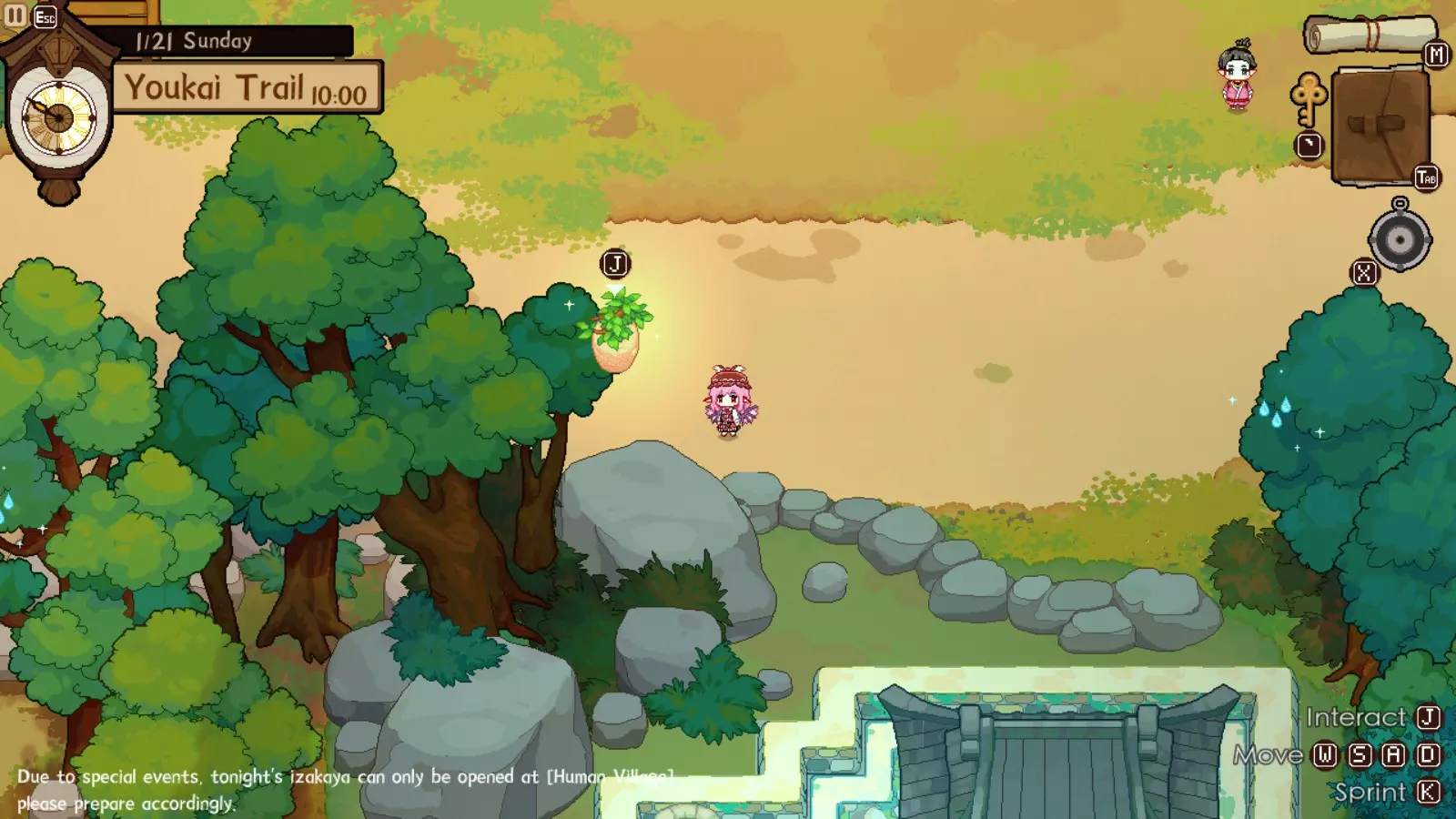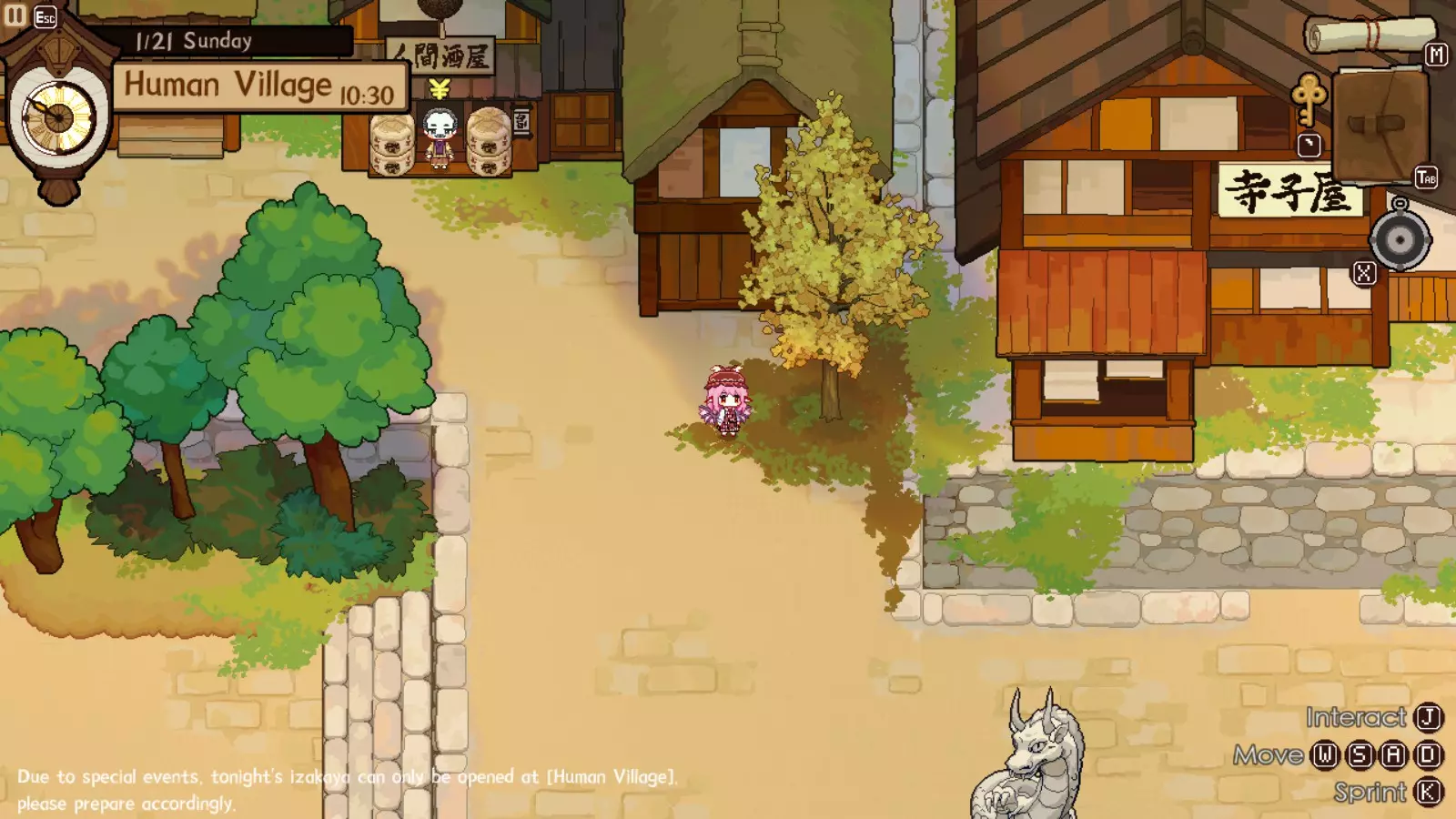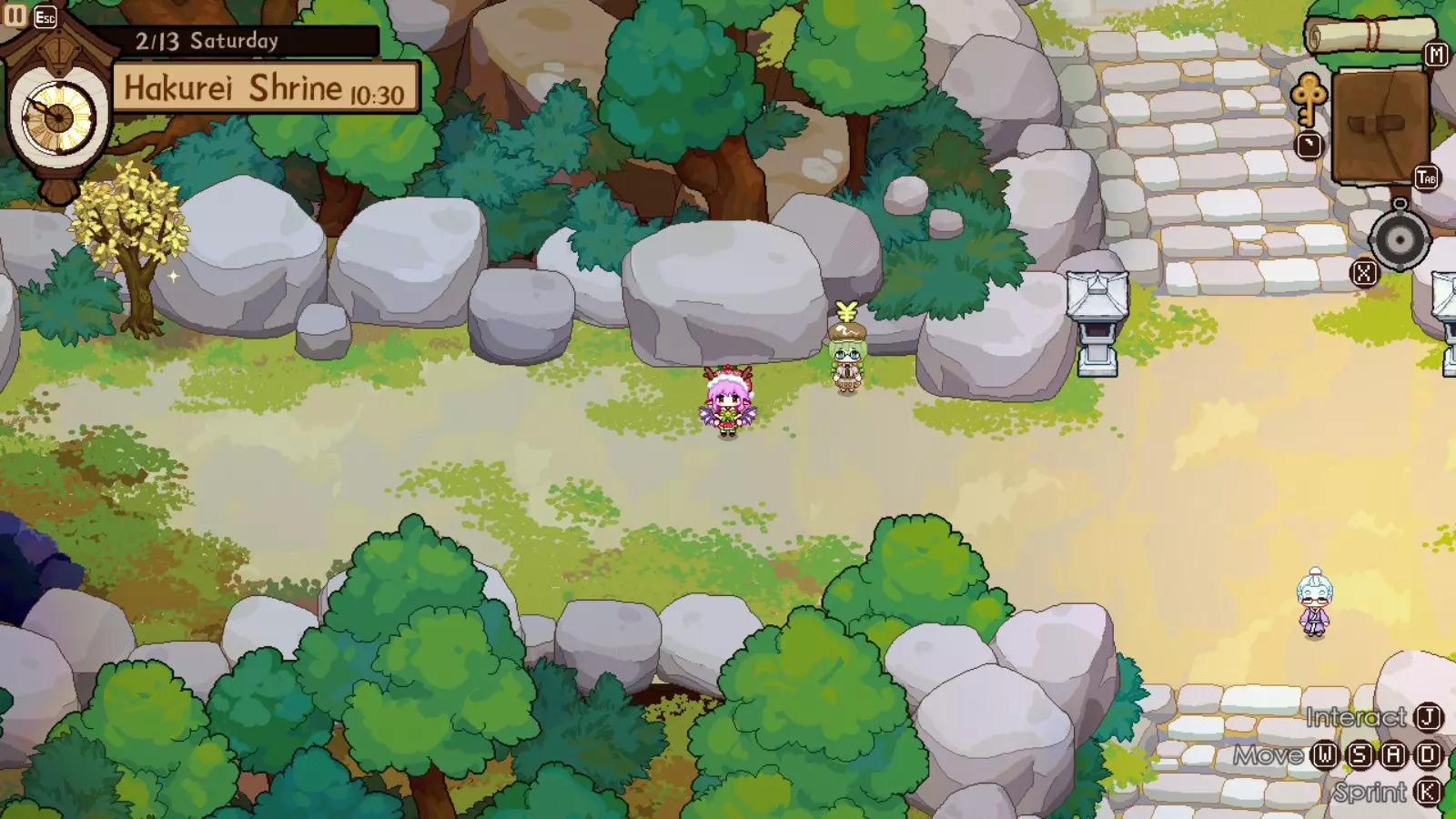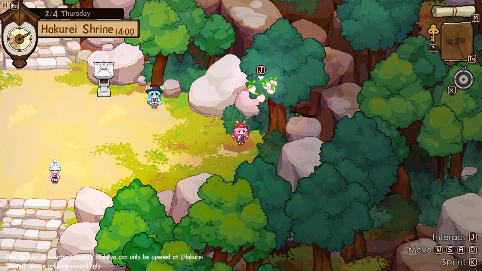 灵梦对此完全赞同,因为你的下一个目的地将是她的神社。我们正开始进入游戏中期,届时将可以通过商人获取稀有材料。如果你未能完成人类村落的任何稀有客人任务,仍可以邀请他们到博丽神社完成。在博丽神社的最初几天是强制流程,并且在第一天结束后你才能将博丽神社的居酒屋推车升级到小屋级别。尽快升级到小屋级别(第二级)是个非常好的主意,因为和之前一样,后续会有强制流程。