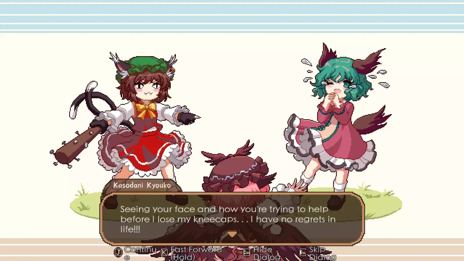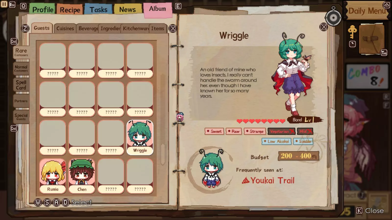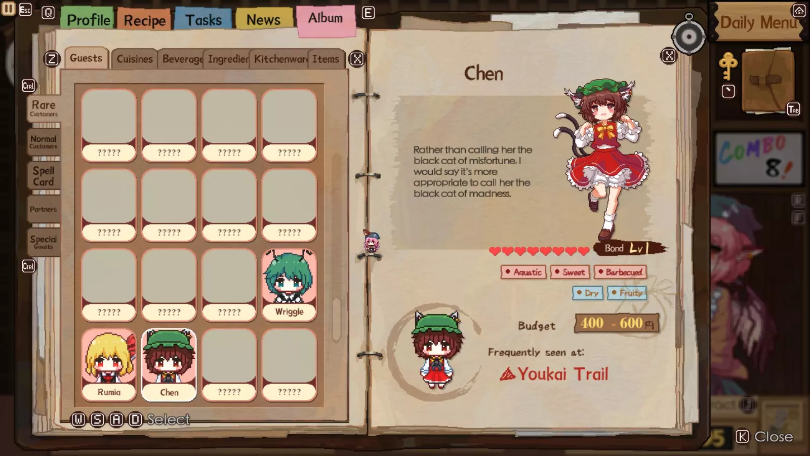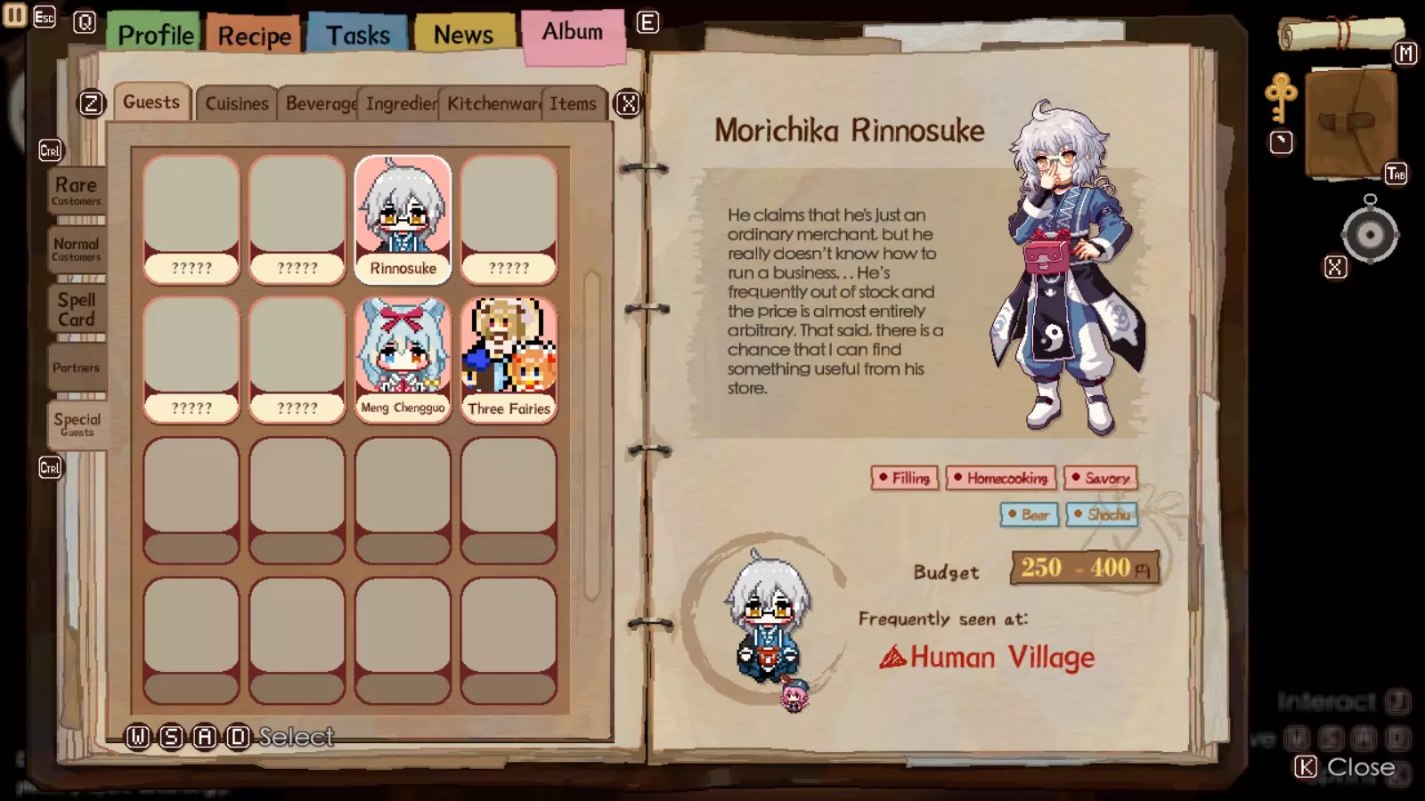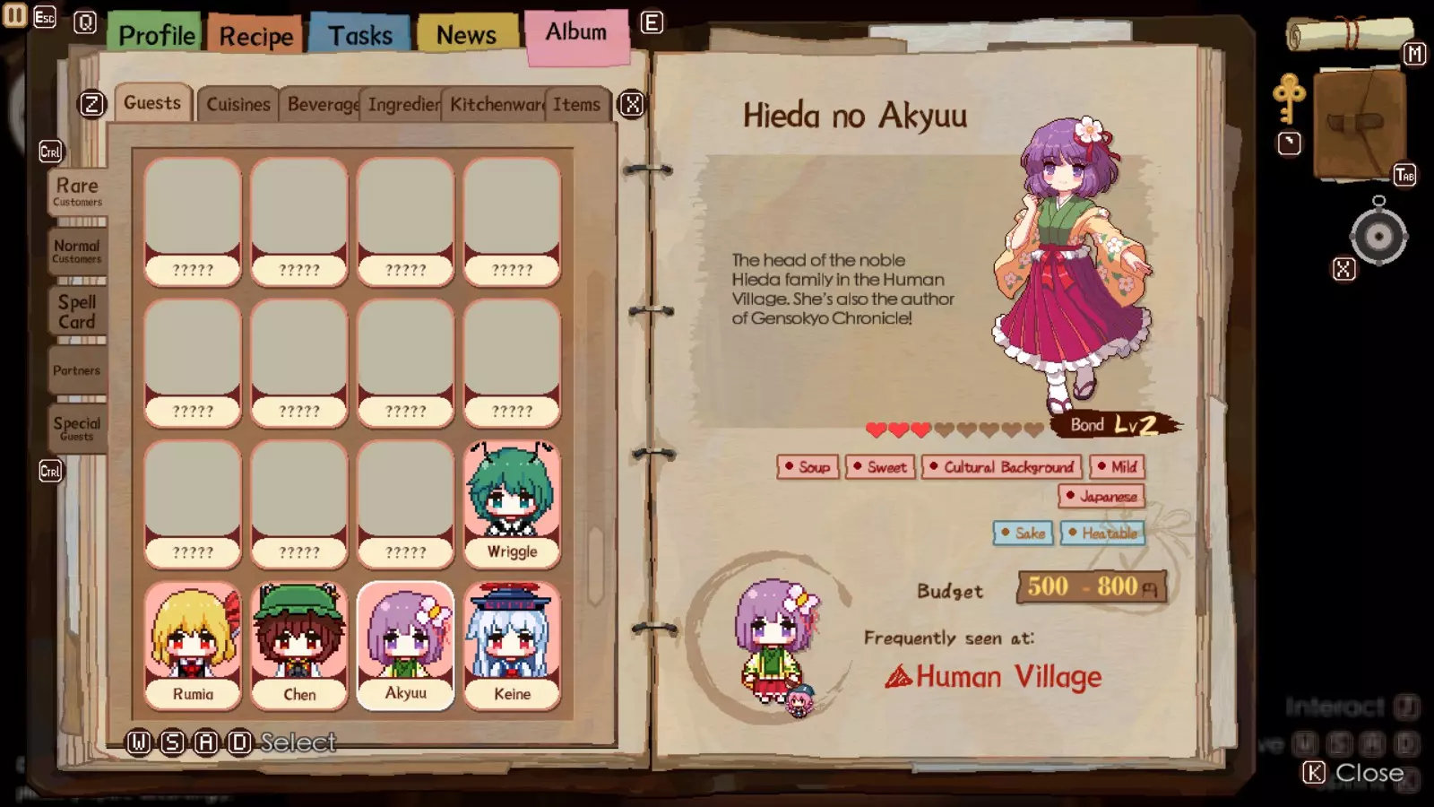 在妖怪小径中,她是与莉格露并列的最重要稀有客人之一。等级5时,她会给你一个居酒屋道具,能使获得的小费增加5%。起初这听起来不多,但一旦你能在极限模式下快速招待客人,效果就会大幅提升。她的标签很容易满足,预算也远高于莉格露和露米娅。她的符卡能提供更多可使用的鱼类,便于获取符卡并循环使用。她的食谱涉及更多鱼类和猪肉,只要运气好,她在用餐后能停留更长时间,陈就相对容易升到满级。【秘制鱼干脆片】也是妖怪小径以及之后人类村落中非常受欢迎的食谱。你还将获得猪肉鳟鱼串,这是一道不错的食谱,尽管目前食材成本相当高。最后,你会得到能量汤,这是一道相当不错且制作简单的食谱,适合日后招待稀有客人。 总体而言:如果你必须选择优先培养至满级的角色,即使有时很大程度上由随机数生成决定,也请选择Wriggle,因为你可以轻松邀请Chen到下一个【居酒屋区域】完成对她的满级培养。这样一来,你就不必花那么多时间收集食材,因为Wriggle会为你代劳。尤其是在后期,时间将是你最宝贵的资源,而金钱除了购买食材和避免被Chen找麻烦外,不一定是最重要的。人类村落 当你最初还清欠陈的债务后,灵梦对你蒸蒸日上的生意已经忍无可忍,想要你搬走。你将被送往人类村落,并且再次面临时限,需要为她那笔欺诈性的债务筹集资金。和妖怪小径一样,这里有3位新的稀有客人,但现在还多了1位特殊客人。如果你启用了联动内容,还会额外增加两位客人。不过通常来说,目前最好先关闭这些联动内容,因为你没有足够的食谱来满足他们的需求。如果你还没将莉格露或陈的好感度提升到最高,可以根据需要返回妖怪小径的居酒屋,但有些日子你必须待在人类村落的居酒屋。那样的话,只需邀请莉格露和陈前往下一个地点,希望她们会出现,这样你就能继续提升与她们的羁绊等级。 注意:强烈建议你尽快将人类村落居酒屋升级到2级,否则你将无法获得足够的收入来避免麻烦,也无法支付食材费用。