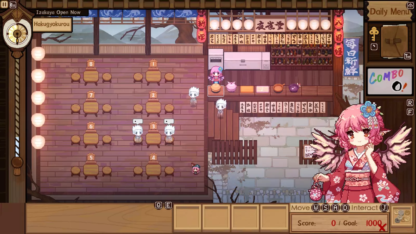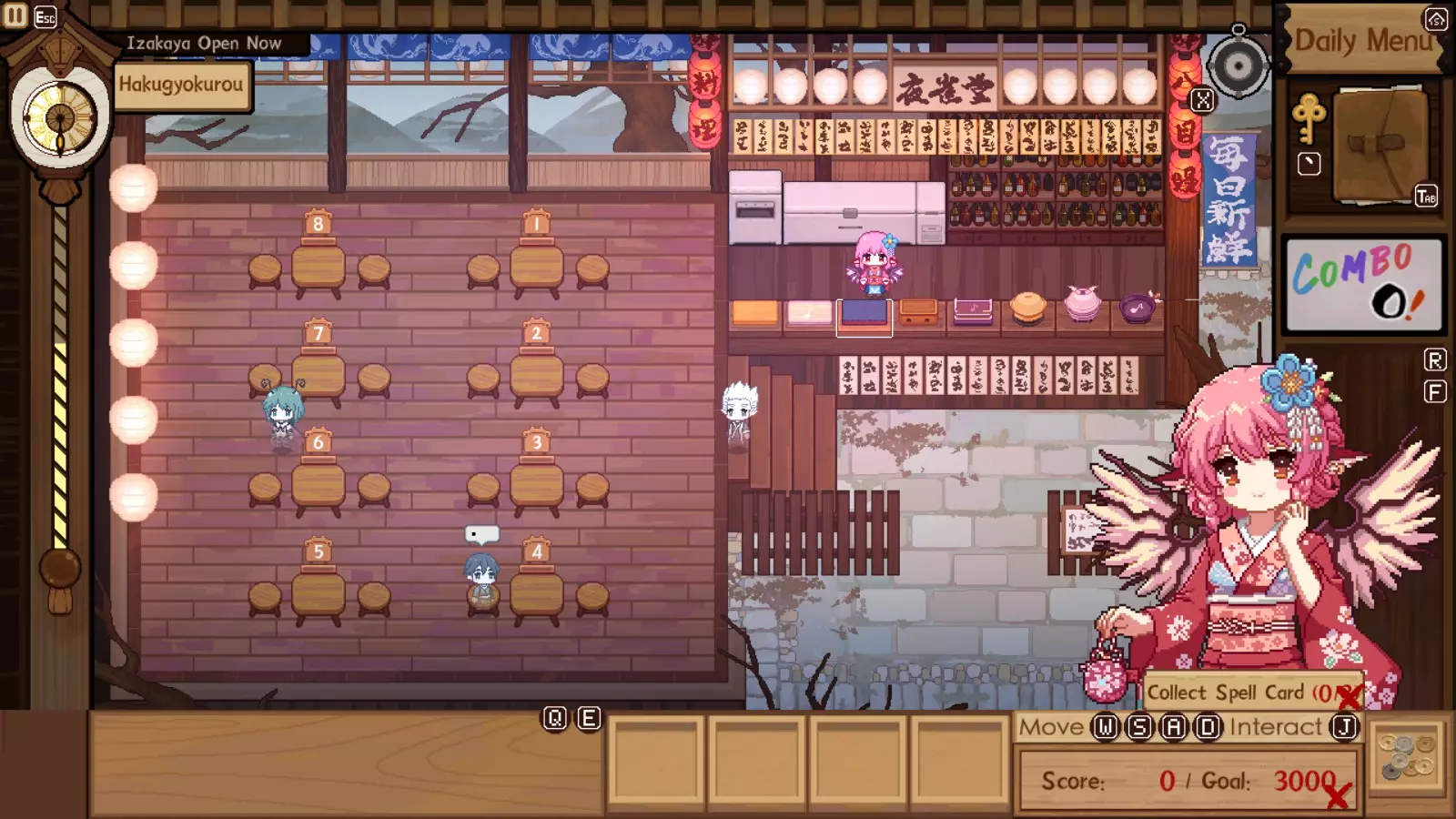 如果你有很多适合居酒屋之夜的食谱都需要用到某种厨具,别犹豫,大胆使用两个相同的厨具。比如,当你有大量食谱需要同一种厨具,或者知道客人们会点很多相同的菜品时,当晚就准备两个同款厨具。这样能加快烹饪速度,减少等待菜品完成的闲置时间。完成的订单越多,连击数就越高,赚的钱也就越多。 记住关键食谱 你放在菜单上的食谱是快速为普通客人开始烹饪的好方法。不过,如果你在想为稀有客人保留某个较难或昂贵的食谱时,却把它放到了菜单上,普通客人可能会大量点单,导致你耗尽这道菜的食材。因此,记住你用于稀有客人的食谱以及所需材料是个好主意,这样你就无需通过将其添加到菜单来走捷径。这是一项非常有价值的技能,尤其是当你之后要挑战额外的试炼/ Boss 时。你不必记住每一个食谱,但了解关键的那些总是有帮助的,这样你就不必每次需要查阅时都拿出笔记本。 Boss 战 这款基础游戏中只有 1 场真正的 Boss 战,不过你也可以将妖梦的试炼本身算作一场 Boss 战。在这些试炼期间,你将无法获得任何伙伴的协助。你必须独自完成所有事情。首次击败妖梦的试炼没有其他奖励,只有一个成就和少量对话变化。妖梦在游戏本体中有两场试炼。第一场在完成第三区域后开启,第二场在完成第四区域后开启。本指南现已包含所有故事模式及DLC Boss的视频片段,如需进一步帮助可查看底部内容。【注意:观看可能包含剧透,请谨慎选择!】 试炼一:第一场试炼中,妖梦会给你预设数量的材料。你需要在第一回合赚取1000日元,第二回合2000日元,第三回合3000日元。顾客将来自之前的区域。如果你拥有食谱,妖梦会自动提供特定数量的对应食材,因此掌握的食谱越多越好。你手头的每种饮品最多可储备15份,因此饮品的种类越多越好。